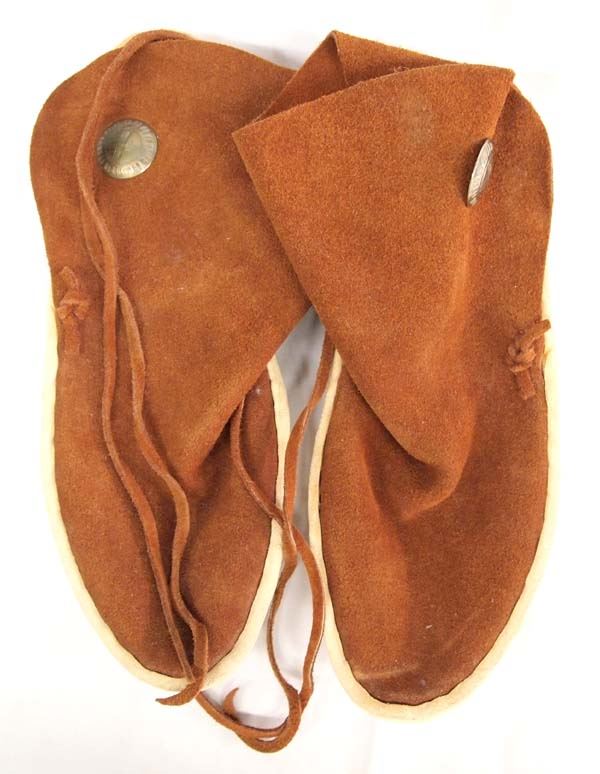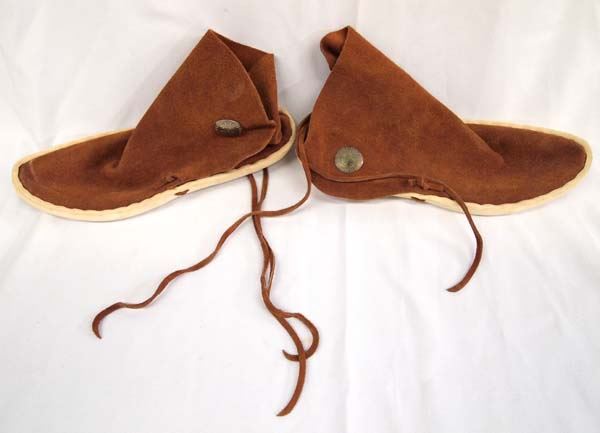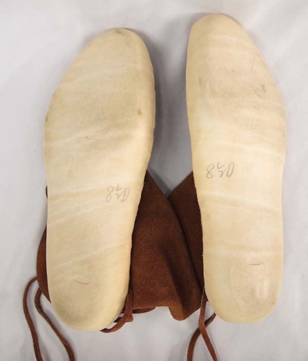Hand Made Leather & Suede Moccasins size 8.5 D. Natural brown in color these wonderful moccasins are a size 8 /12 D width. They have hard leather soles and suede leather uppers with a metal button and leather sting tie closure. they are 6'' tall.