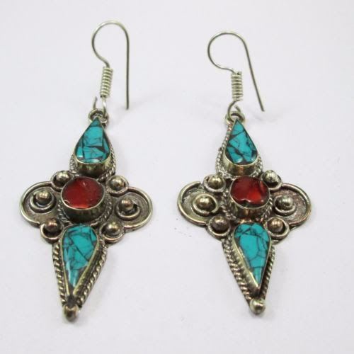 Vintage look ......Natural Turquoise & Coral Earrings......It was skillfully made with large natural Turquoise, each in a deep Tibetan Silver setting. and balance the design perfectly. Turquoise is used virtually worldwide for jewelry making, and is highly prized for its brilliant colors, which vary from mine to mine. The distinctive webbing patterns and variations of color in the stones on this wonderful piece are typical of the natural Turquoise found throughout much of the Himalayan region, where Turquoise has been used in jewelry-making since centuries.”””Note- All stones in this necklace are Natural.....Guranteed....Vintage look but necklace is brand new.