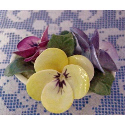 This is pretty hand modeled and painted, fine bone china Floral ornament - made by Crown China - England - Lovely pansy flowers displayed in a tiny oval footed dish - Very good condition but for a two tiny chips off the leaves, Measures about 2" high and about 3" long - Buyer to pay 7.00 for ship. - We prefer payments trough Paypal, Visa, Master Card or Money Order - Thanks!