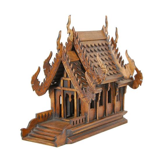 Used in Thai Buddhism to house free roaming spirits in nature (and keep them out of the main residence); 20" X 17"; stained dark handcarved teak