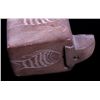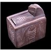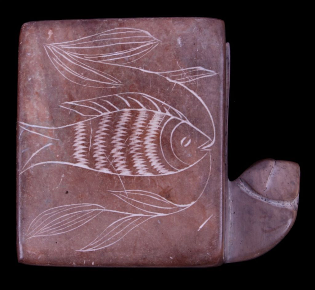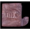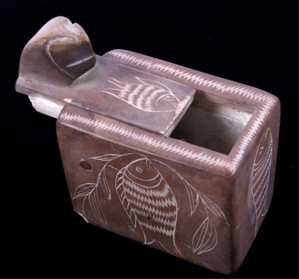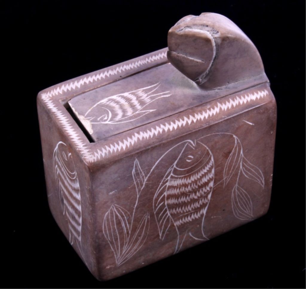 This lot features a hand made trinket box. This is fired piece of pottery. It has been etched with a fish design. The box is in good condition, showing a minor chip in one corner. The box measures 2" x 1.25" x 2.5".