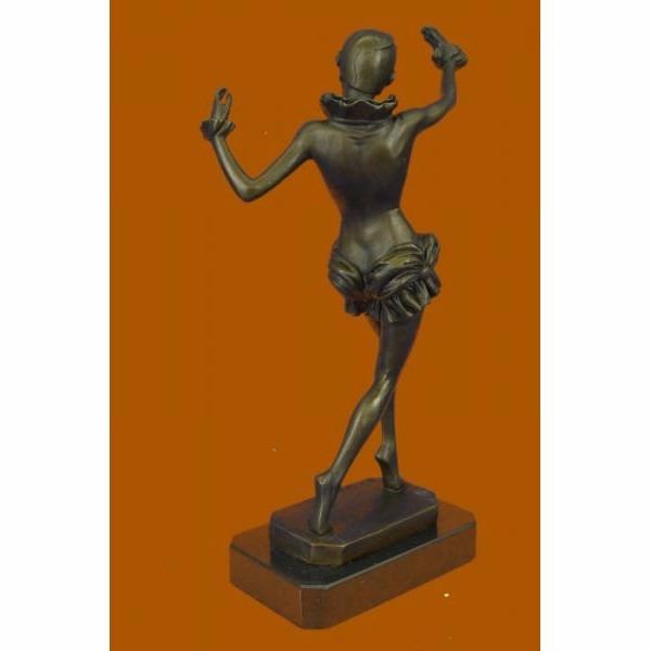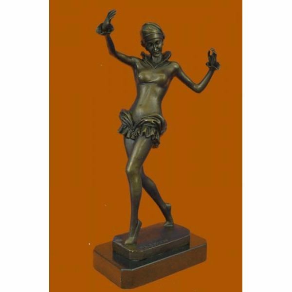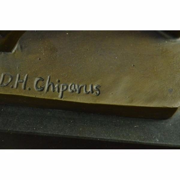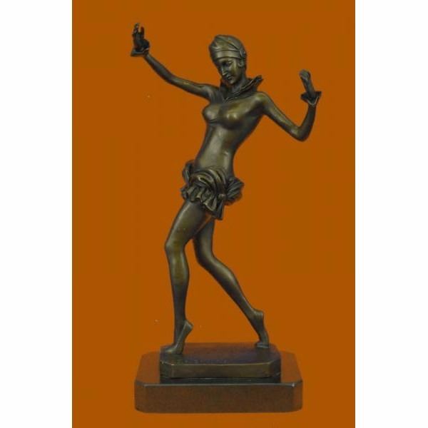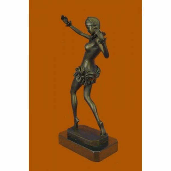 With grace, agility and flexibility, this vibrant dancer is light on her toes. Based on one of D.H. Chiparus' many sculptures of dancers, this dancer stands on the balls of her feet, as she shimmy's across the stage. Her beaded yellow patina mini skirt jiggles behind her as she shakes her hips to the music. This nimble dancer tilts her head down slightly and elegantly stretches her arms above her head. She also wears a matching beaded top, headdress and sandals. 100% bronze and handmade, this brown patina sculpture was cast using the "Lost Wax Method" and mounted on a marble base. It features the signature Chiparus. Condition: This sculpture is in perfect condition. Bronze Dimensions with Marble Base:Height 13.5" x Width 7" Marble Dimensions: 6" X 4" . Height without base: 12.5 " Weight : 7 LBS Inventory 63YRD13154536