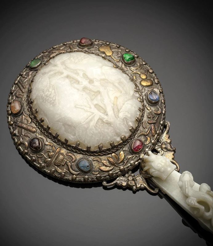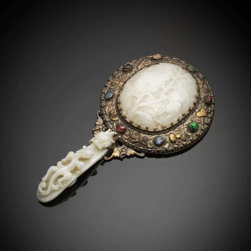 This exquisite hand mirror features a jade panel on the back, finely carved with figures and floral motifs, showcasing a refined artistry. The jade is lustrous and pure, while the surrounding frame is decorated with filigree metalwork and set with colorful gemstones, adding brilliance and luxury. The handle is carved from white jade, adorned with scrolling and mythical beast motifs, reflecting both elegance and tradition. A refined piece with both functional and artistic value, it is highly desirable for collection and display.