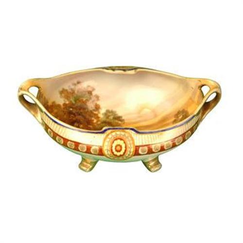 Hand painted porcelain 4 footed center bowl with two handles. The scene in the bowl features a farm house under the trees with geese in the yard. Unmarked. Good condition. 2.2 lbs. Overall heigh 5". 12.5" x 8". No chips, cracks or repairs. Mid 20th C.