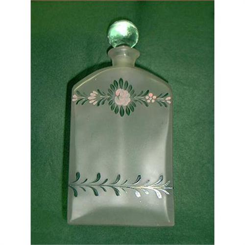 Hand Painted Frosted Bottle with Clear Round Glass Stopper. In excellent shape. Has painting of pink roses, ribbons and green vines.Great decoration piece. Stands 8 1/2" tall, by approx. 4" wide.