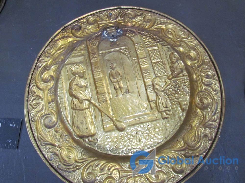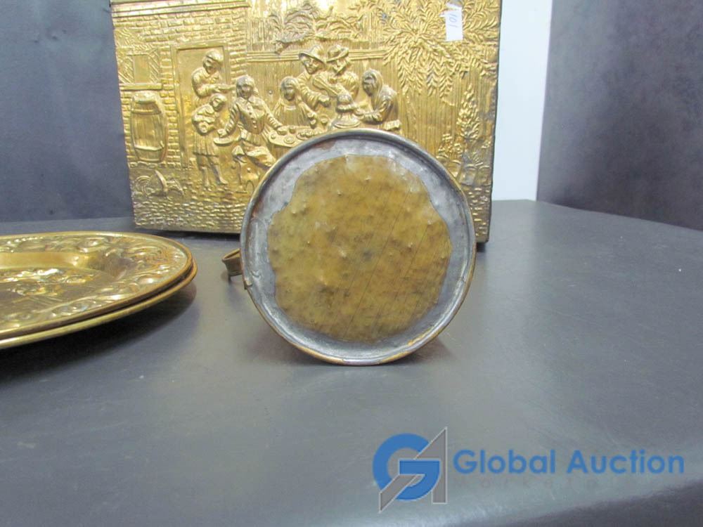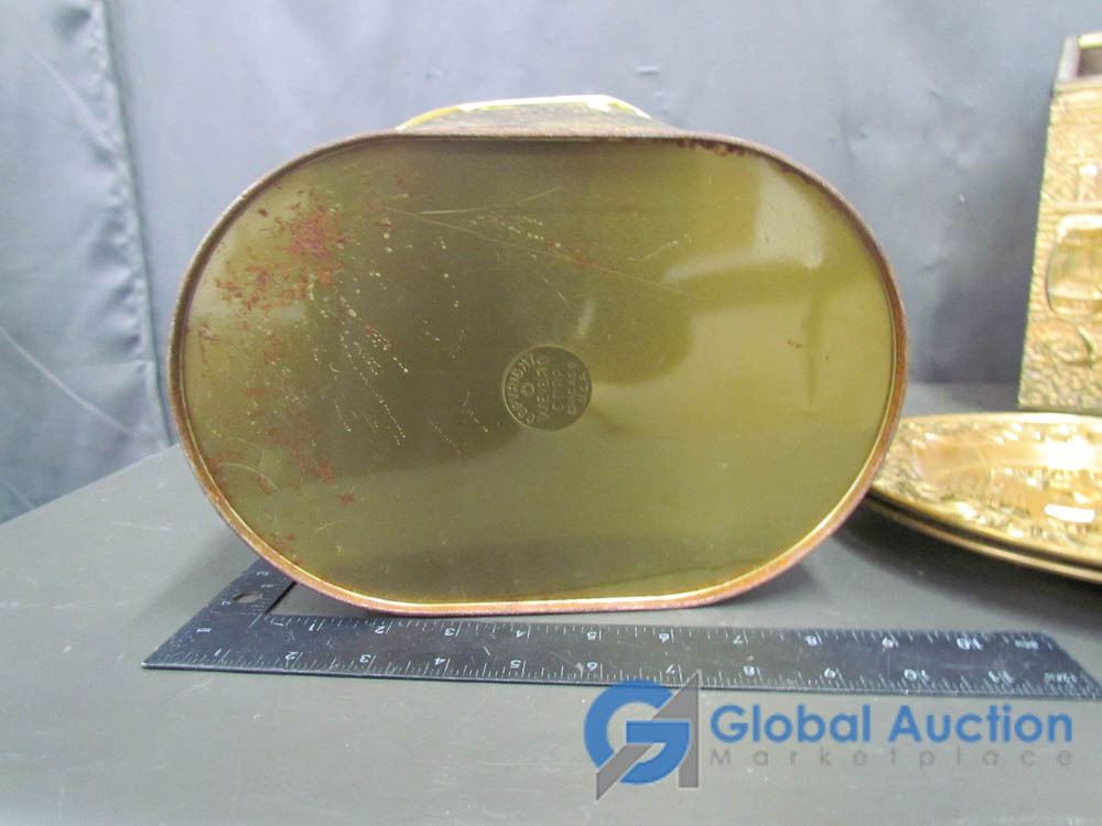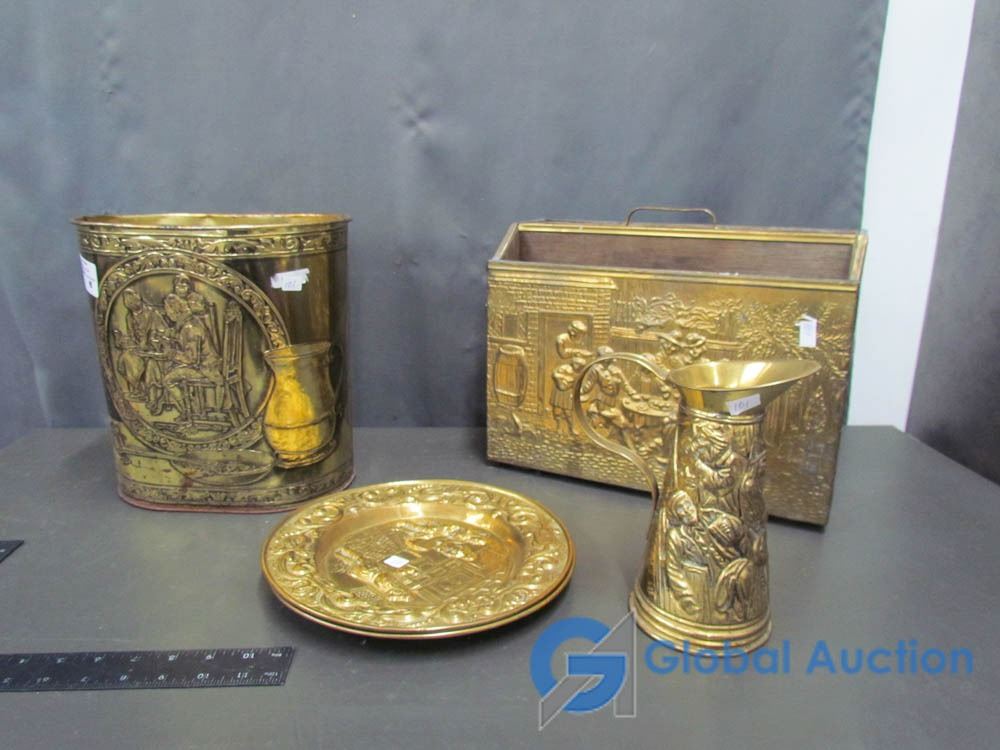 Hand Painted Brass Magazine Rack, Garbage Can, Pitcher and (2) Plates