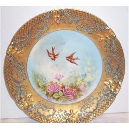 This extremely STUNNING Hand Painted Limoges Plate is decorated with two brown birds and lovely blooming flowers. The outside edge of the plate is heavily gold gilt and has a blue hand painted design. This plate is in SUPERIOR condition with no chips, cracks, dings or hairlines and it measures 7.50" in diameter. It is also artist signed by the French Factory Artist Golse. The plate is marked on the back with the familiar Limoges Logo.