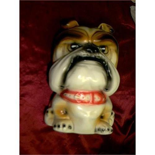 Hand Painted Bulldog Bank. This is a nice Bulldog bank and hand painted and in great condition. It is 9" H X 6" X 6" and very colorful. Has the money slot on top, and a place on the bottom to get it out. Great gift item for anyone who has a dog like this. Hope you like it. PRICED LOWERED TO SELL, CLEARING OFF OUR SHELF'S FOR NEW ITEMS, GREAT DEALS FOR YOU, DON'T MISS THE NEW PRICE.