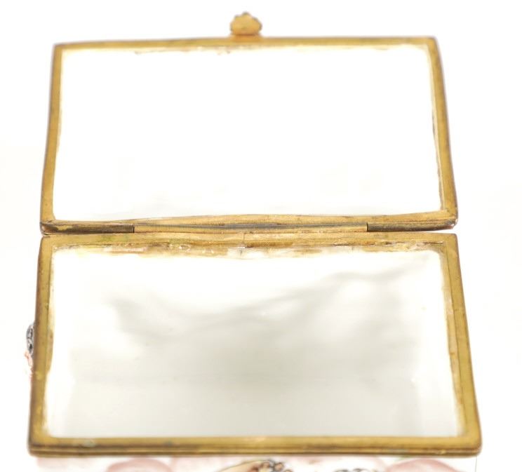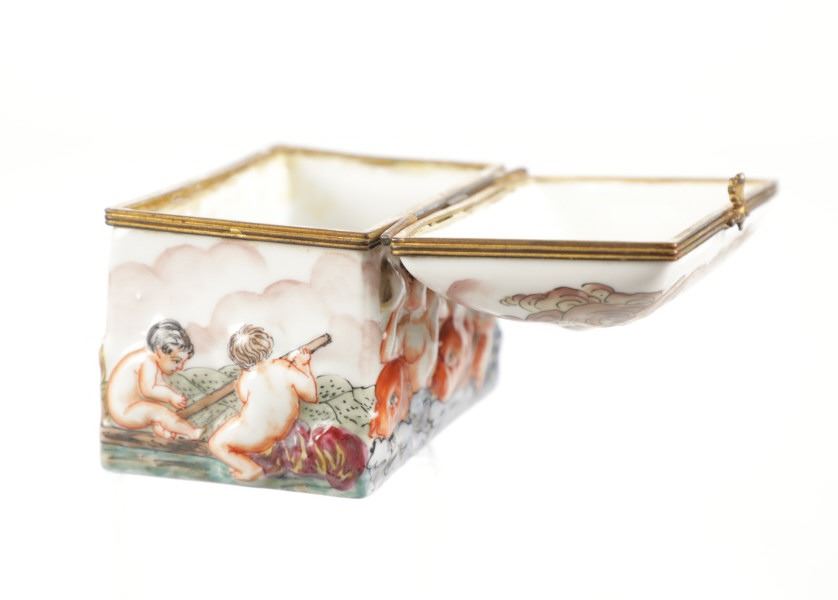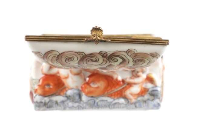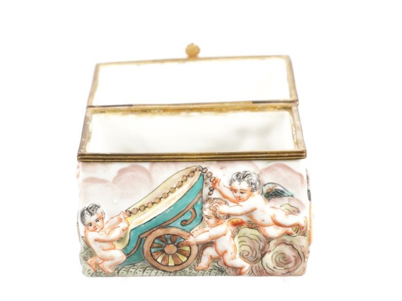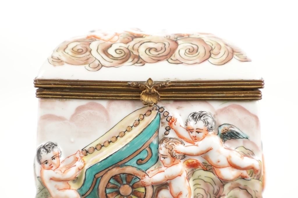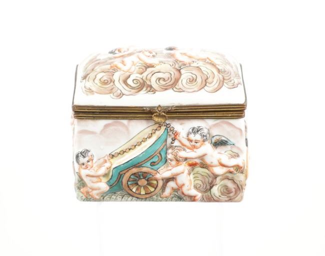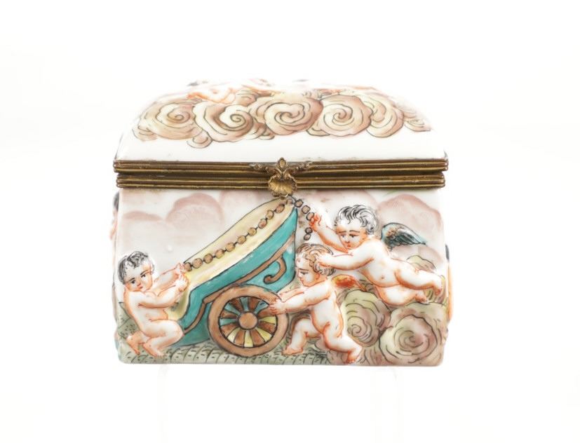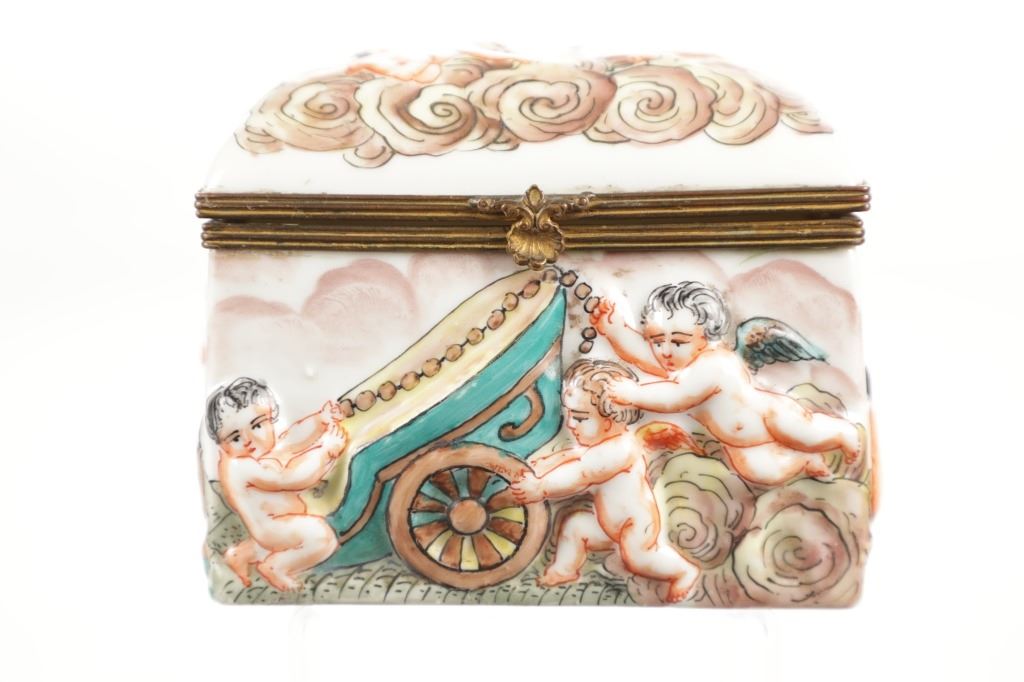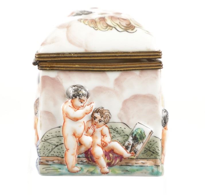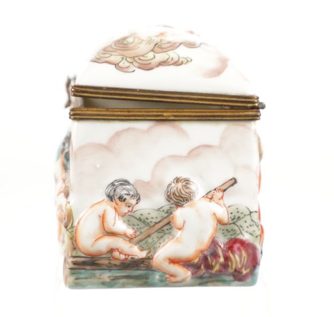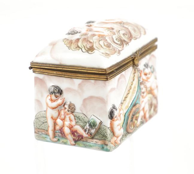 For your consideration is this mid 18th century, hand-painted capodimonte trinket box marked with a crown and "N". The box is attributed to the Spanish King's Royal Factory in Naples, as the blue crown and "N" were only used in that factory. The crown and "N" mark was retired in 1834. The trinket box shows highly detailed, hand-painted cherubs doing various activities throughout the box such as fixing a cart, farming, riding large fish, blowing a trumpet and painting. The box features a small lock on the front and gold colored accents and hinges with the hand-painted scenery showing colors of orange, grey, tan, beige, green, blue, yellow, black, red and purple. The bottom is marked with a blue crown and "N" with another faint marking in the corner reading "E.T.". The box shows good condition overall with some slight wear but no obvious signs of damage or cracks. The box measures 2 3/4" L x 4 3/8" W x 3 1/2" H and weighs approximately 12 ounces.