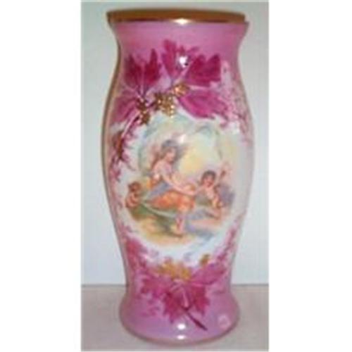 This extremely STUNNING Hand Painted Bristol Glass Vase is decorated with adorable cherubs on a pink scrolled background. This vase is in SUPERIOR condition with no chips, cracks or dings and it measures 6" in diameter and is 12.50" tall. This vase has very little wear to any of the painting.