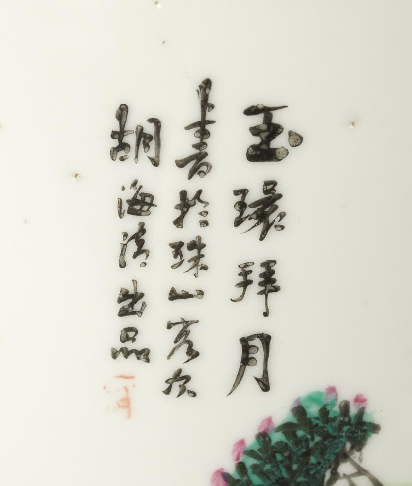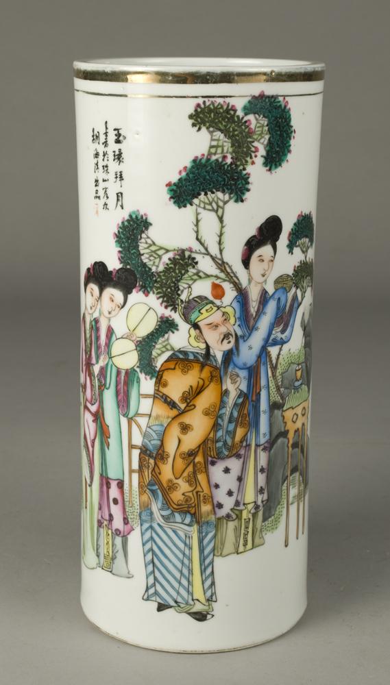 Painted to depict figures standing with fans in front of trees, with incense burner on small table, and poem(?) in top right and gilt rim. 11" H, stamped in red illegibly on bottom. Wear to gilt rim. 20th Century.