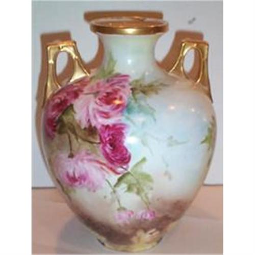 This fantastic Hand Painted Austrian Vase is decorated with lovely and quite colorful blooming chrysanthemums. The two handled and footed vase is in SUPERIOR condition with no chips, cracks, or dings and it measures 7" in diameter at its widest point and stands a very stately 8.75" tall. It is marked on the bottom with the familiar green Austrian Logo.