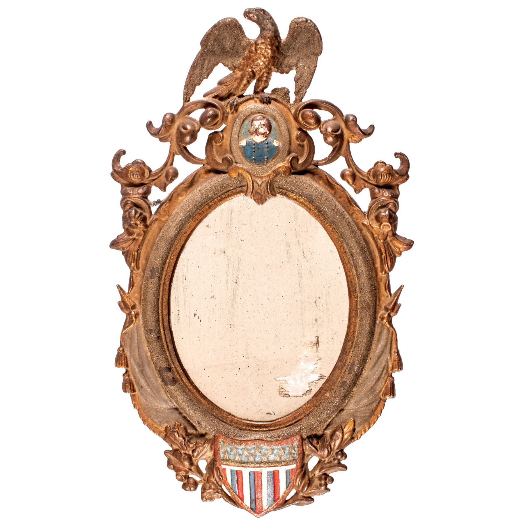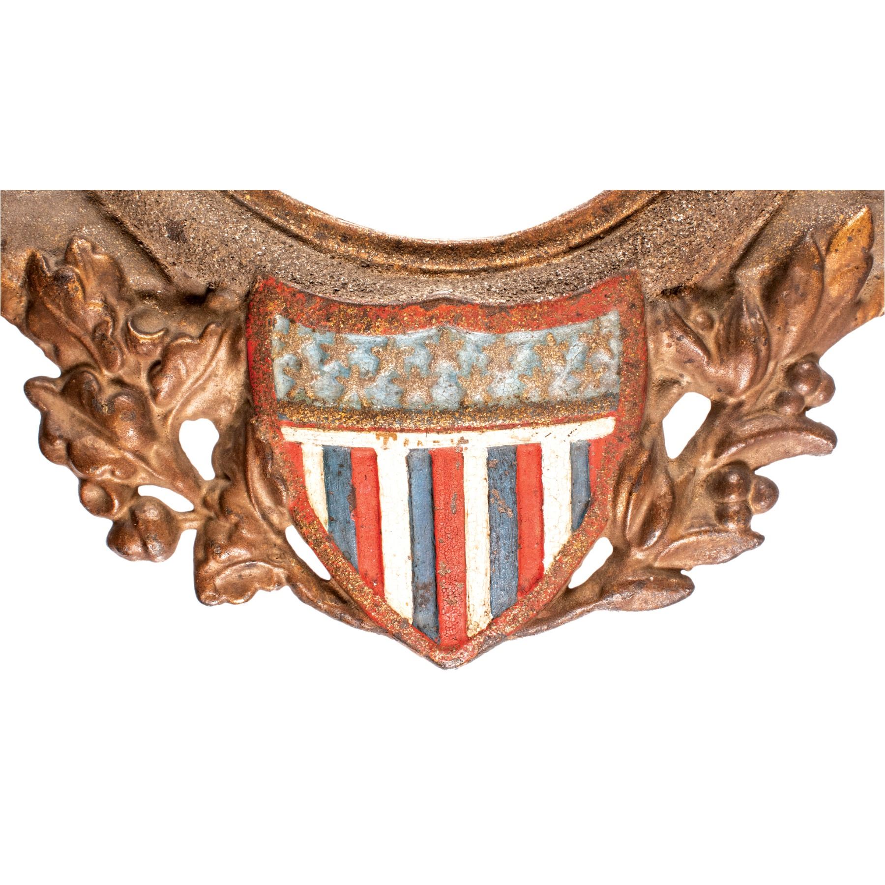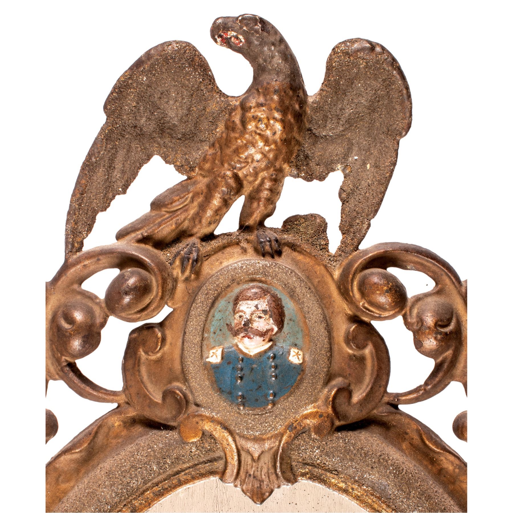 c. 1865 Civil War Era, Patriotic American Eagle Topped, Decorative Cast Iron Hand-Painted with Union General George B. McClellan and Heraldic Shield, Hanging Wall Mirror, made “By. S. Sailor”, Very Fine.