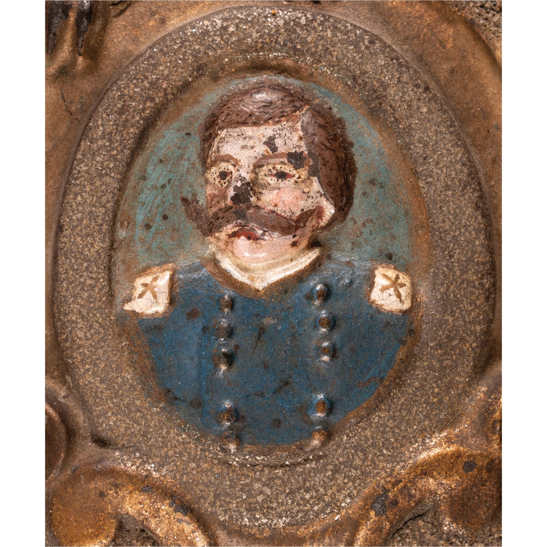 This large impressive Patriotic Mirror measures about 19” tall x 12” wide with its Cast Iron decorative and Hand-Painted frame displays an American Heraldic Eagle at top. Reverse cast text for its maker reads: “BY. S. SAILOR.” Below is a 2” tall Hand-painted Portrait of Union Major General George B. McClellan, shown just below the Eagle. At bottom a Hand-painted Red, White & Blue Heraldic Shield protects below the central mirror. Minor paint wear and imperfections, the mirror has a 1.5” x 1” void at bottom right. Highly unusual, solid, and the first we’ve offered. Rare indeed, and ready to hang on display.