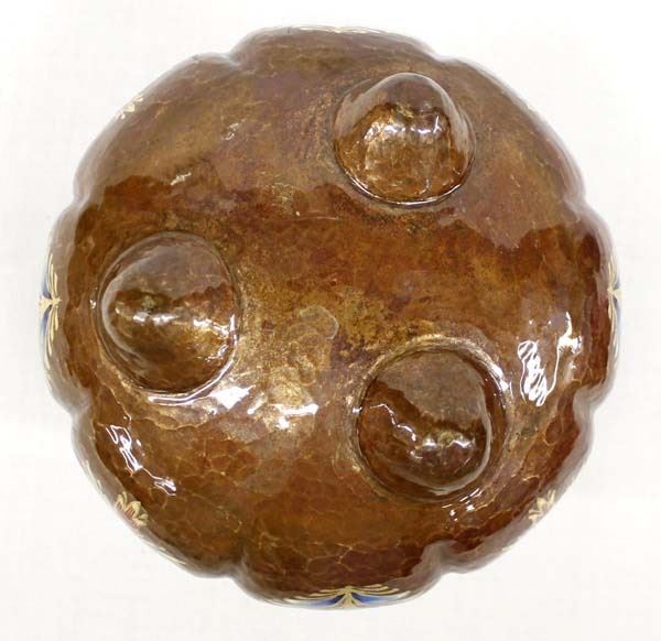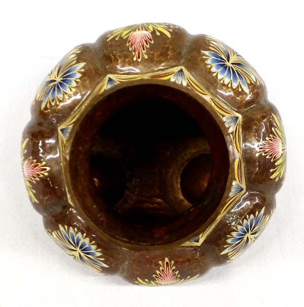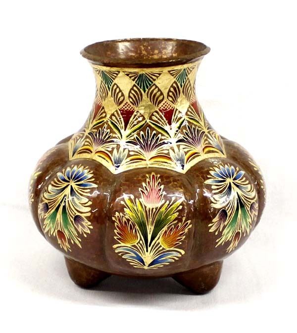 Hand Painted Copper Vase, measures 6.5''H x 7''D, three legs on bottom, thick walled piece and beautifully hand painted