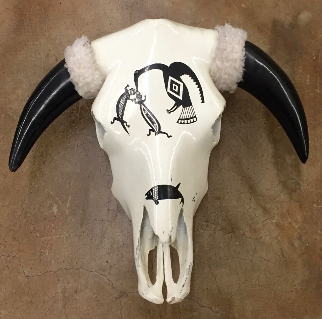 This hand-painted skull measures approximately 18 inches long by 19 inches wide. Signed Luis M. Please look closely at pics - they are an important part of our description. Shipping: There will be a $10 handling / packaging fee for shipping this lot. The actual cost of postage will be added on top of that.