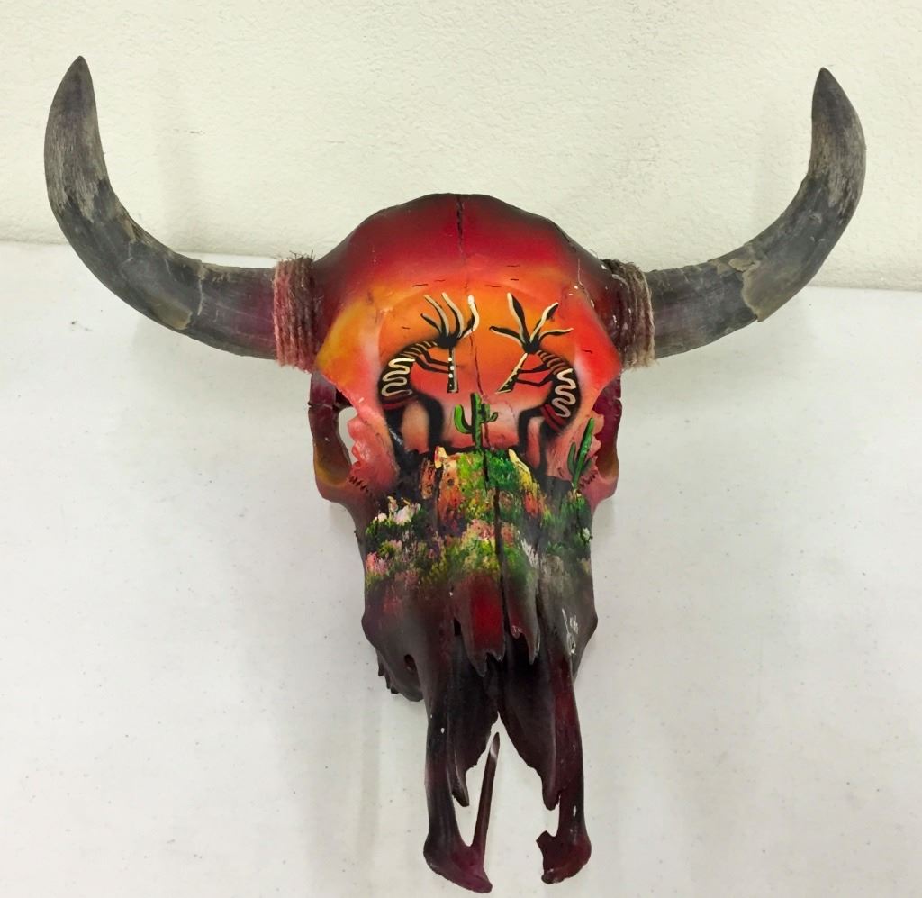 This hand painted skull is signed by the artist and features two Kokopelli dancers in a desert scene. Measures 20” wide by 18” long. Please look closely at pics - they are an important part of our description. Shipping: There will be a $10 handling / packaging fee for shipping this lot. The actual cost of postage will be added on top of that.
