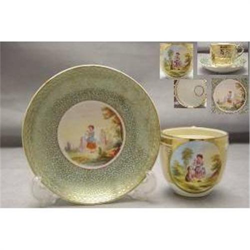 Hand Painted Cup And Saucer Suggested to Be Sampson Bridgewood And Son c1850 Not Marked To Base The Saucer Pale Green With Allover Gilding And Central Picture Of A Girl With Dog. The Cup Is White Ground With Allover Gilding And The Picture Of The Girl With Dog. The Cup Has Gold Banding To The Inside Of The Cup.