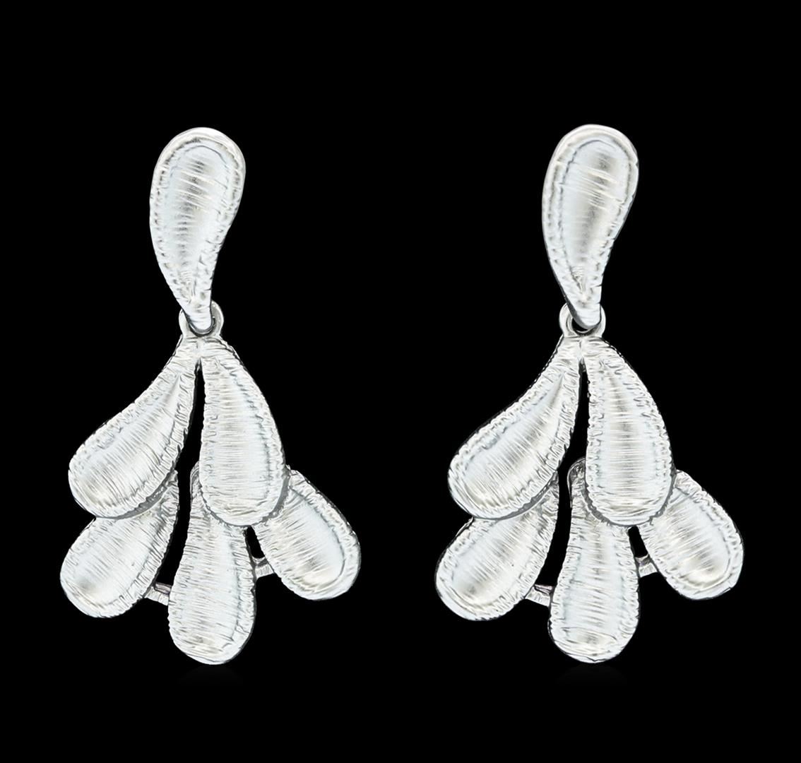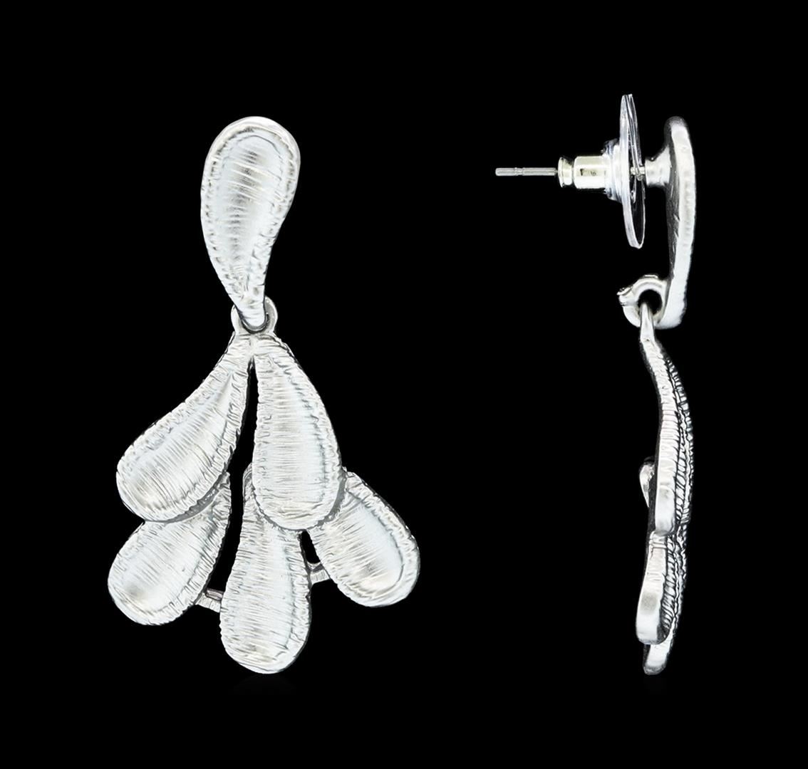 High end designer jewelry. Hand Painted Earrings - Rhodium Plated. Rhodium Plated Metal/1.5" Drop. Silver. Post. Total Weight: 8 grams.