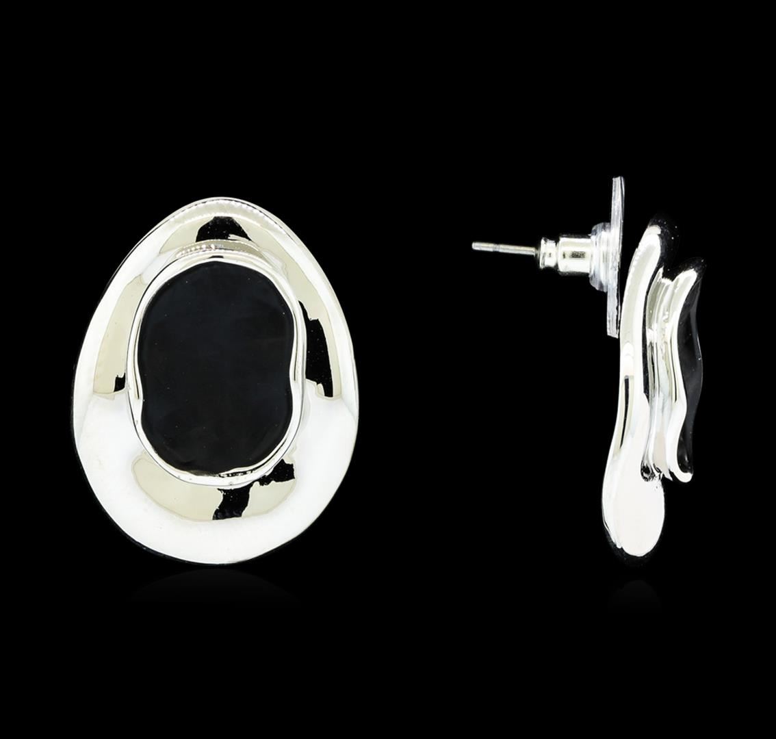 High end designer jewelry. Hand Painted Earrings - Silver Plated. Silver Plated Metal/1" Drop. Silver/ Black. Post. Total Weight: 8.4 grams.