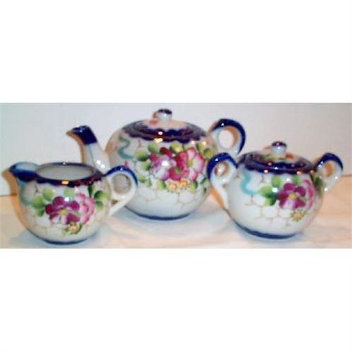 We are offering you this fantastic Hand Painted Tea Set all for one money. This tea set will consist of the teapot and lid, sugar bowl and lid and the creamer. Each of which are hand painted with a lovely full blooming floral pattern on the front and a bud of the flower on the back and then each is highlighted with a fantastic cobalt blue color that really give depth to the painting. Each piece is expertly painted and each piece is in SUPERIOR condition with no chips, cracks, dings or hairlines. They are marked on the bottom with the familiar Japanese green logo.
