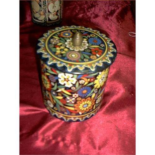 This is one very colorful Tin all covered with assorted Flowers, and it is hand painted from Holland. It is so nice, I thought it was all enameled, as it looks that great. The condition is just great and it is 6.5" H X 5.5" Diam. It has 3 like footed metal pieces on the bottom, and is just a show piece. I have seen many, and this one just stands out. Hope you like it to. If I am wrong and it turns out to be enamel, well your even better than being painted. It looks that nice. PRICED LOWERED TO SELL.
