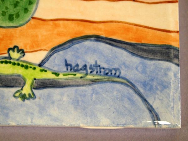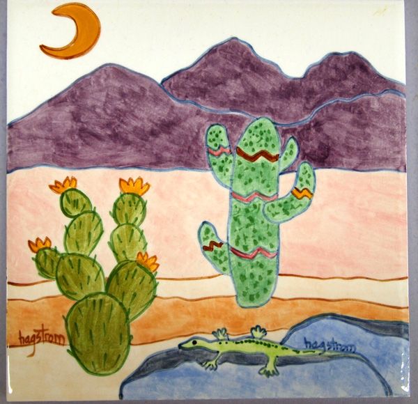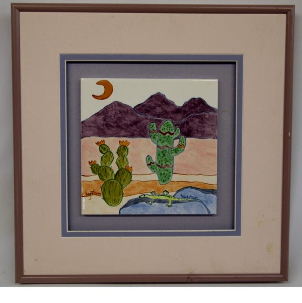 Hand Painted Framed Tile Southwest Scene -Hagstrom. Charming scene of the southwest desert painted and signed ''hagstrom.'' The tile is 6'' square and is double matted in a metal frame.
