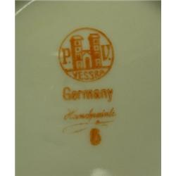 German chocolate pot with 2 cups and saucers. Pink roses on grey background. Marked PV Vessra / Germany / Hand Painted. Pot is 9" tall, cups are 3.25". Condition: Excellent