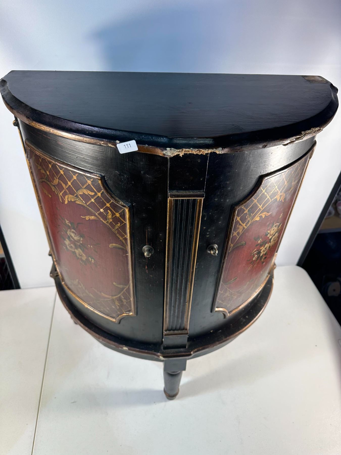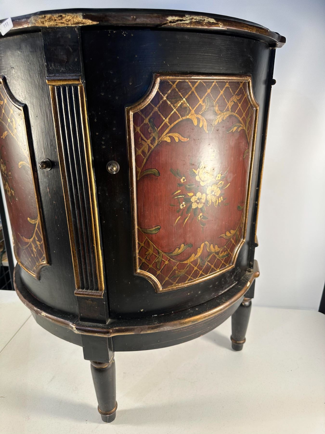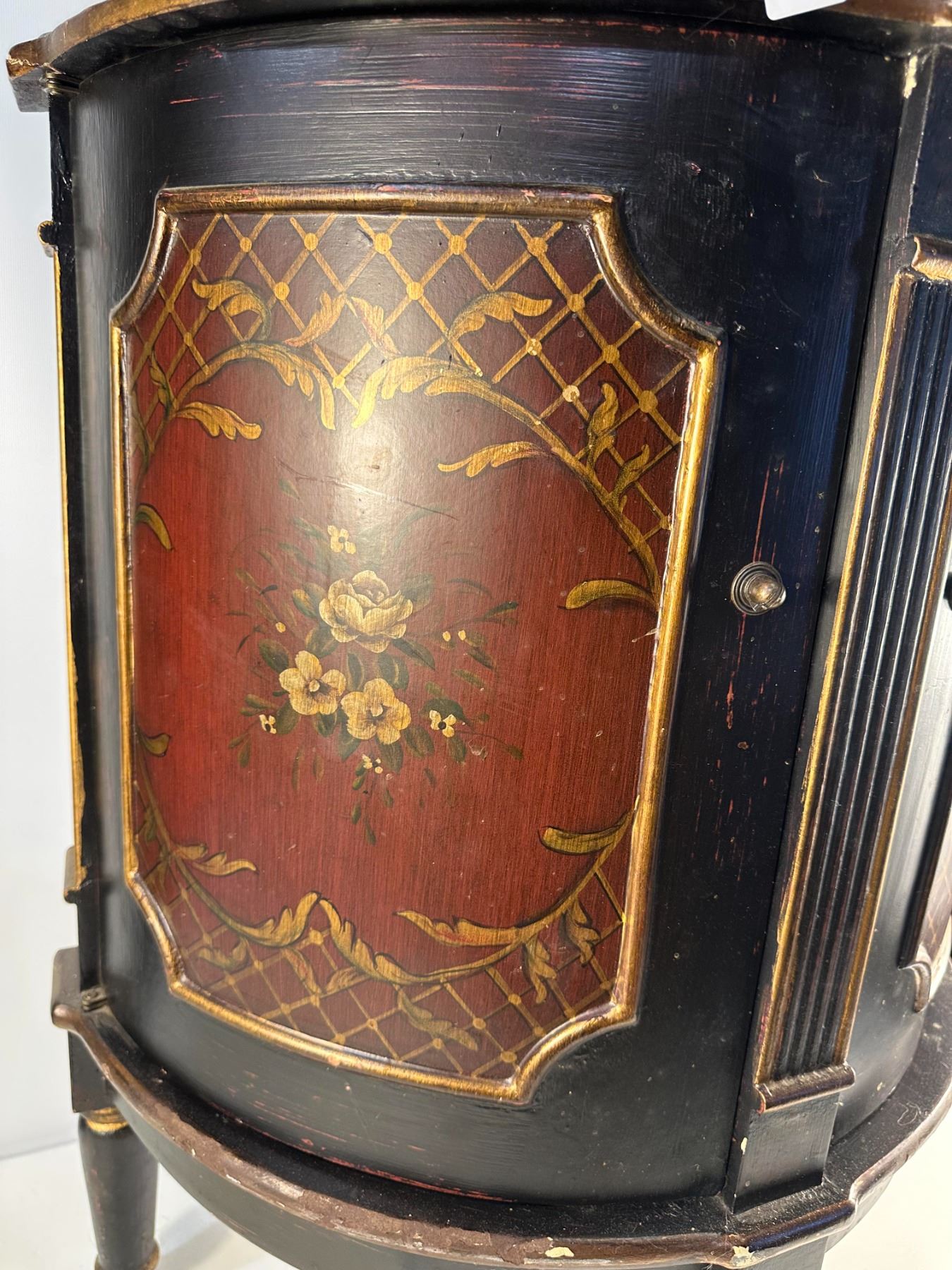 Elegant curved-front wooden cabinet featuring floral hand-painted panels with gilt accents and classic tapered legs. Decorative black and burgundy finish with gold detailing. Single-door storage; traditional European style. Some edge wear and surface marks consistent with age and use.