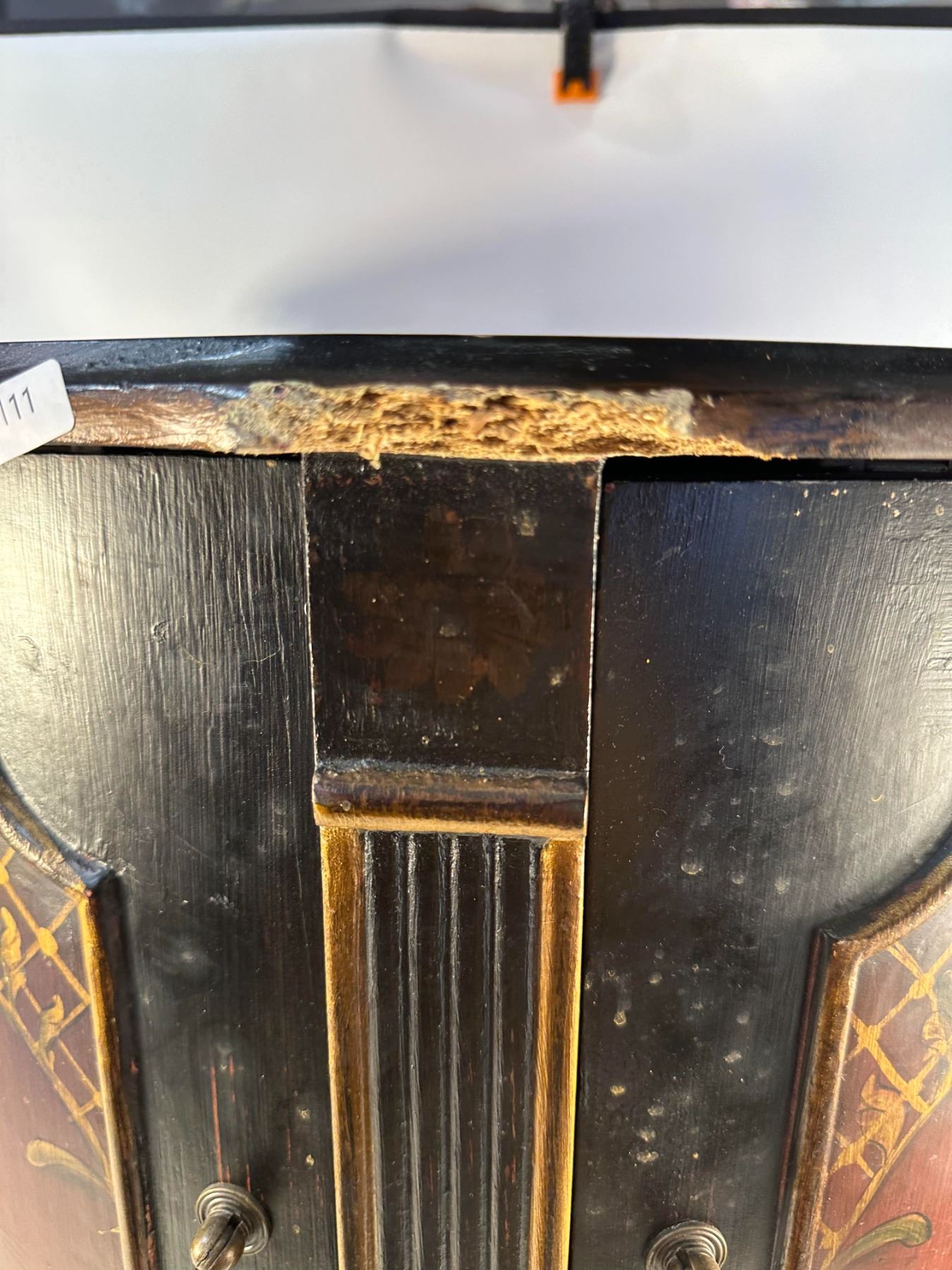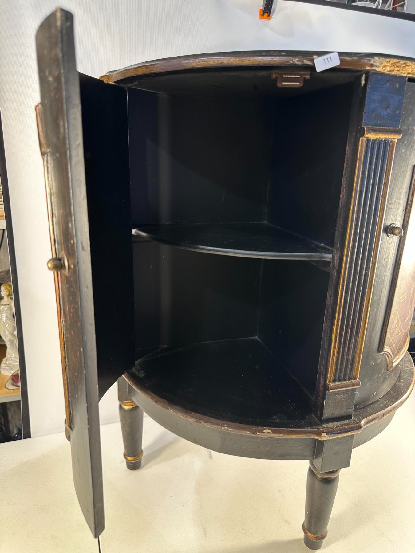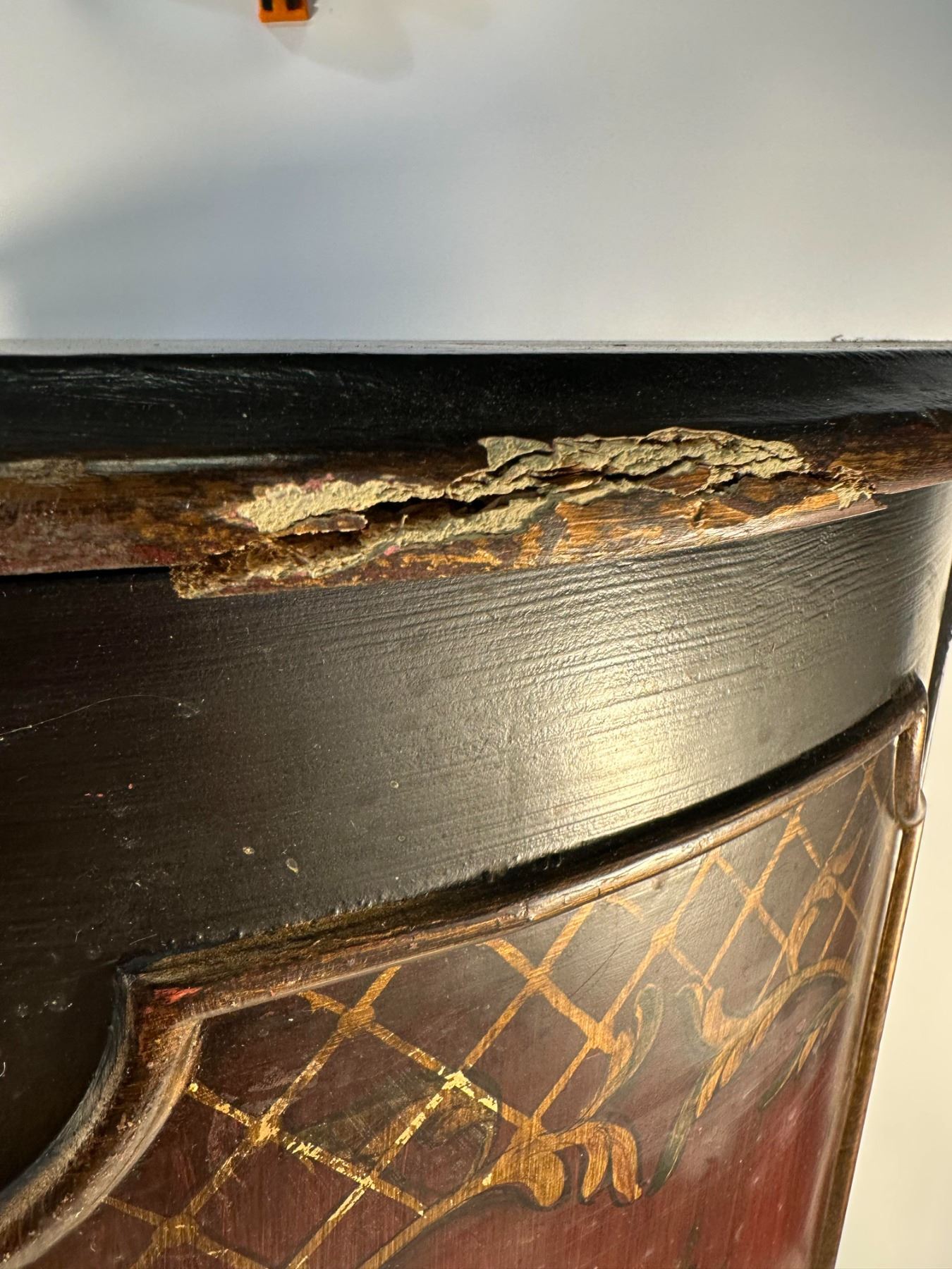 Elegant curved-front wooden cabinet featuring floral hand-painted panels with gilt accents and classic tapered legs. Decorative black and burgundy finish with gold detailing. Single-door storage; traditional European style. Some edge wear and surface marks consistent with age and use.