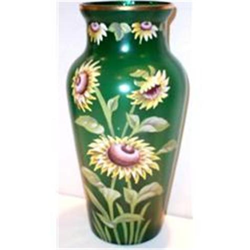 This is an extremely STUNNING piece of hand painted enameled Glass. This is a large Hand Blown Green Glass Vase that is hand painted with blooming large yellow sunflowers and then the rim of the vase is gilt with gold. The vase measures 6.50" in diameter and has a 4.50" diameter opening and stands a stately 13" tall. The condition of the vase is SUPERIOR with no chips, cracks, dings or even gold or paint loss. We have attempted to show you the grouund pontil on the bottom of the vase in our close-up photo. Sorry to say I don't know the maker but do know this is English. An extremely stunning piece for your home or collection.