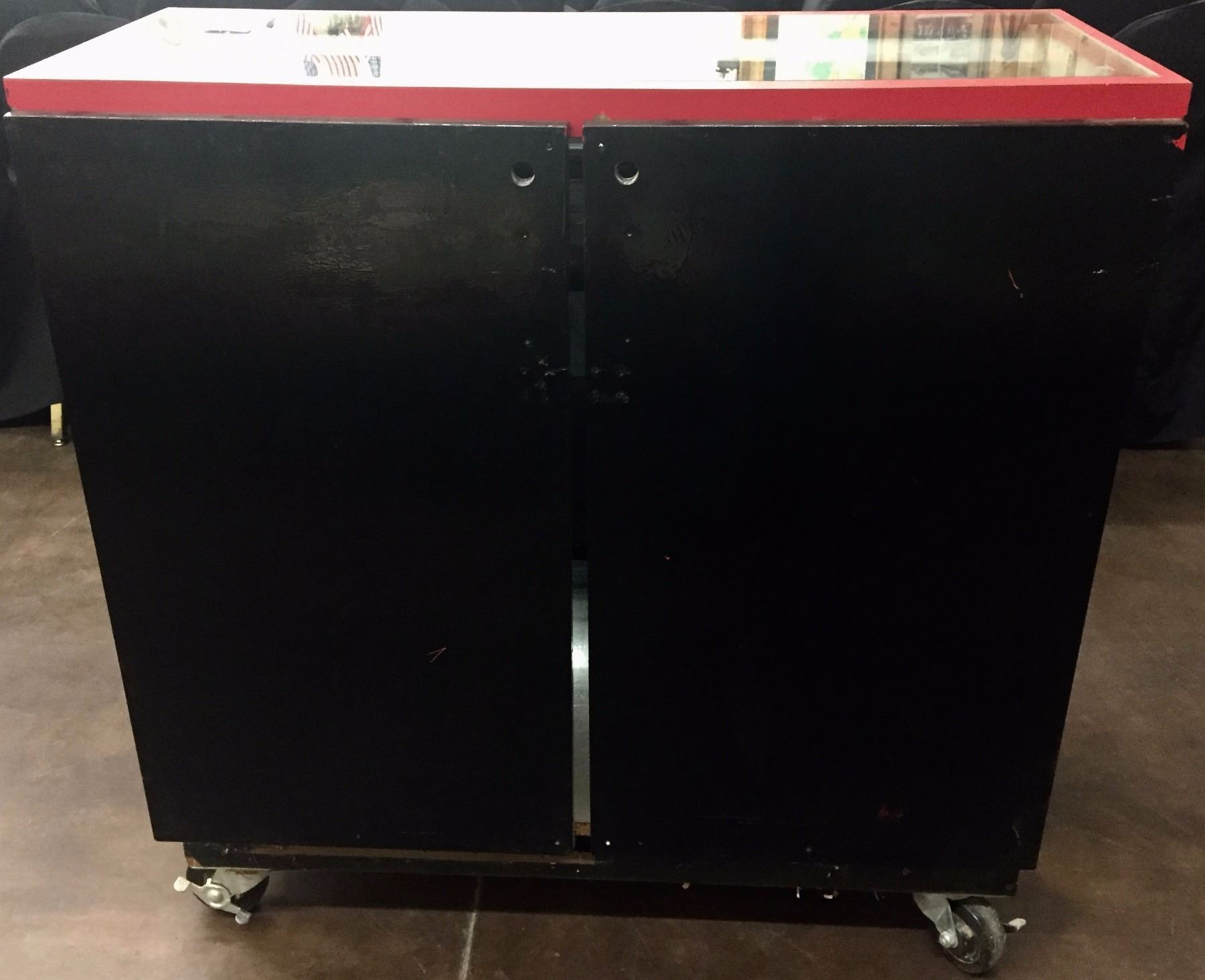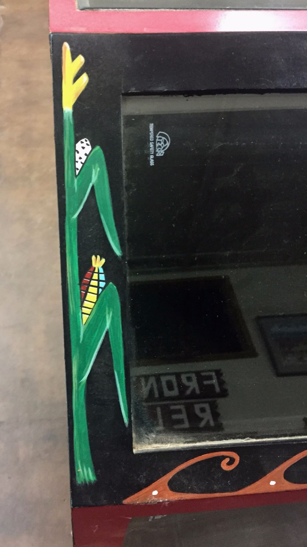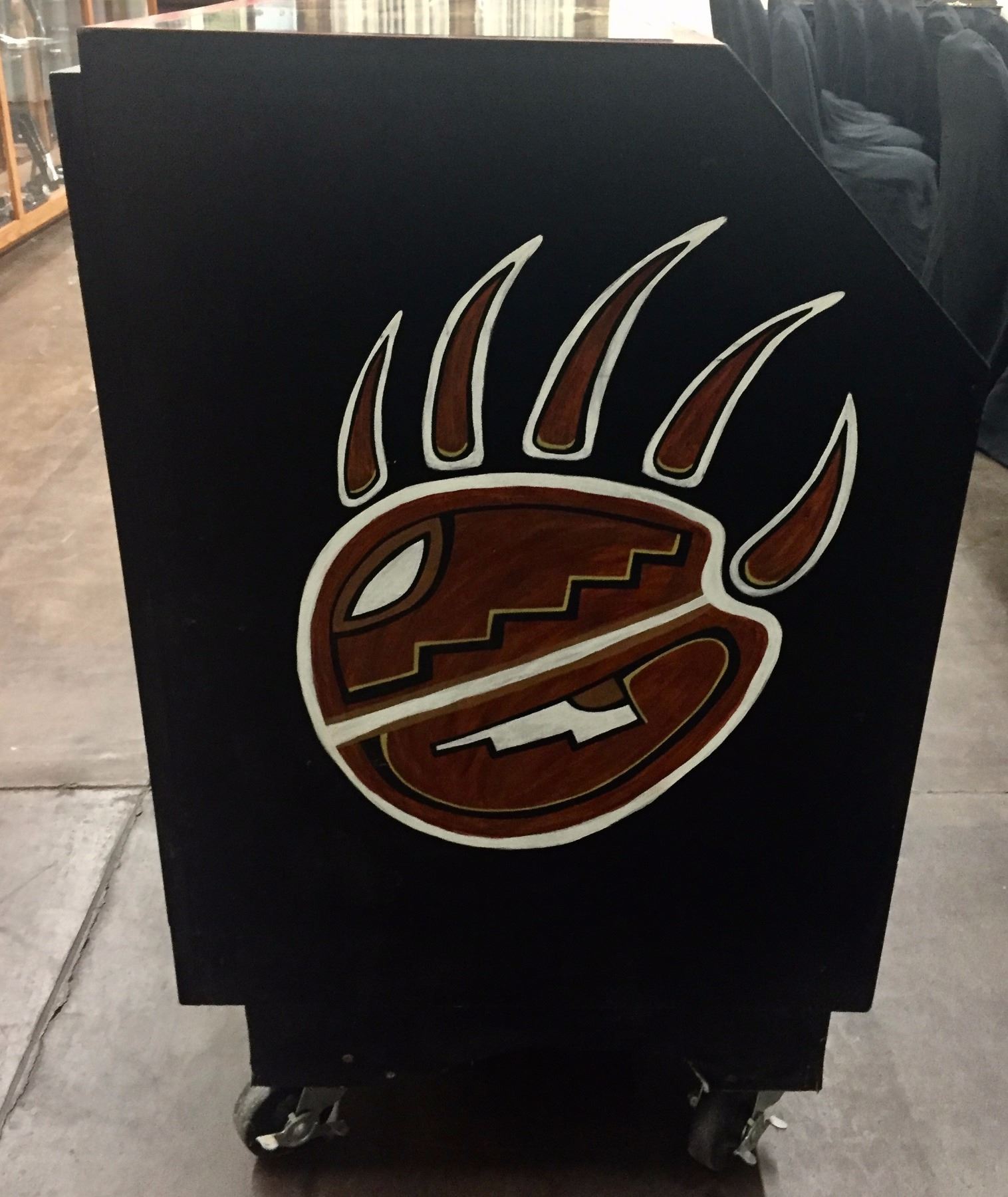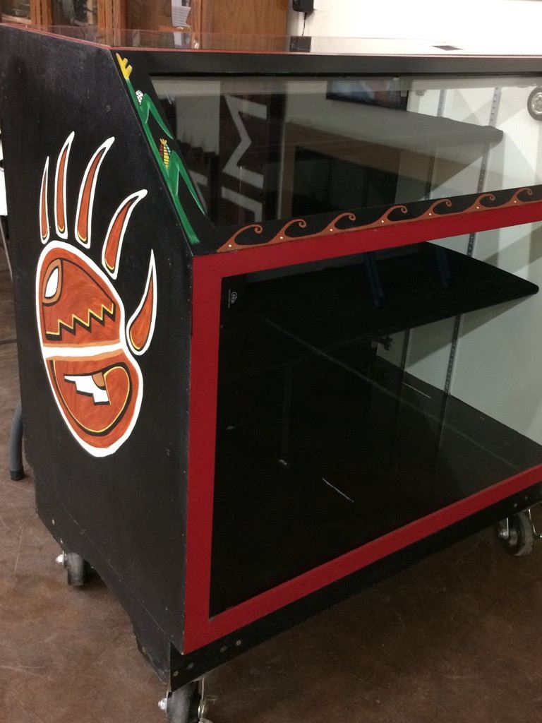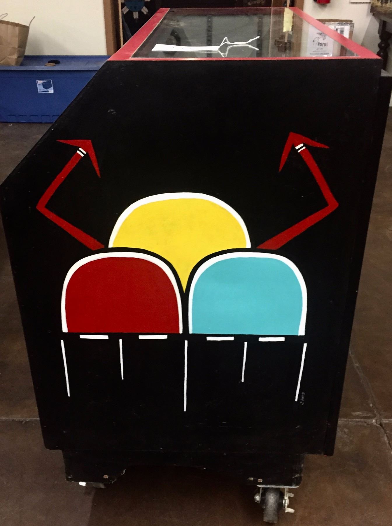 Maker: Painted by John David Sr. (Hopi). Approx. Age: Circa 2013 on the painting, unknown on the actual cabinet. Size: 38" wide x 25" deep and 41" tall. Additional Info: This showcase has casters so it can be easily moved around (also has brakes). It was hand-painted by John David Sr., a well-known Hopi artist. Matches the one in lot 150 (but with slightly different designs). Condition: Pretty good for its age, normal wear expected and a couple of dings here and there. Please look closely at the pictures - they are an important part of our description. Shipping: Local pick-up only. If you need shipping, you will need to contact a shipper.