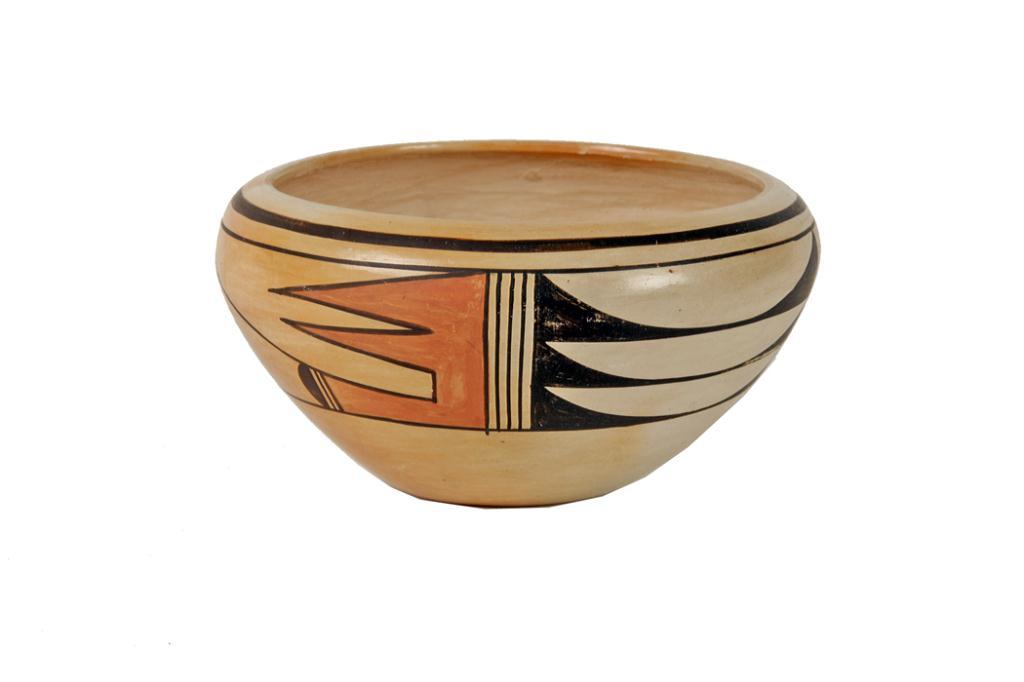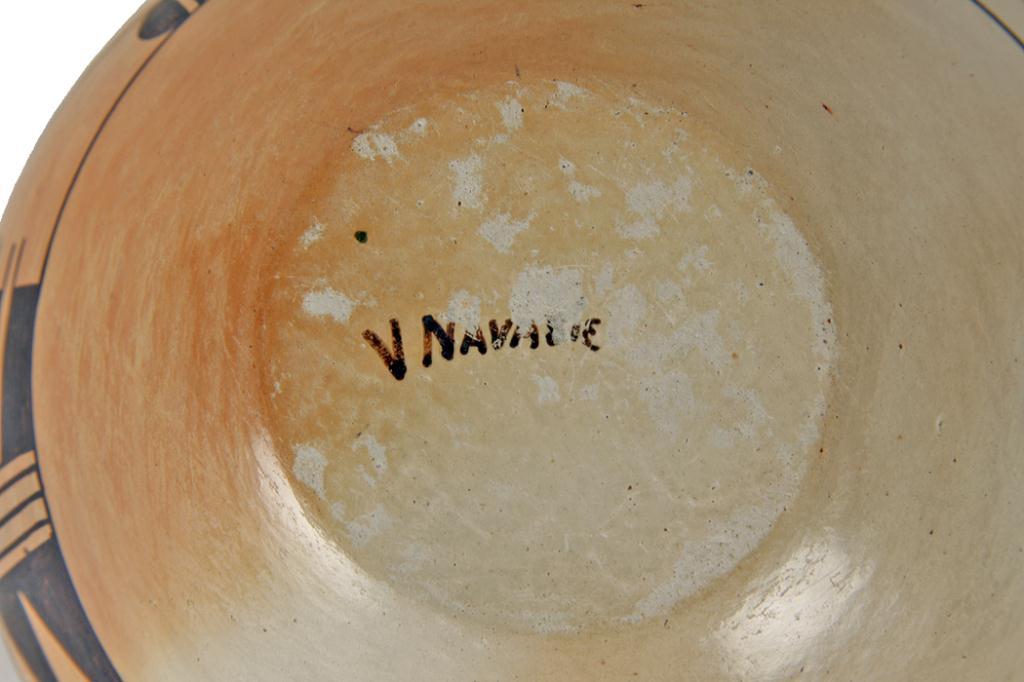 Hand Painted Hopi Pot Signed on base by noted Native American artist V. Navasie, measures 6"x3". In overall good condition with lots of polychrome remaining.Signed on base by noted Native American artist V. Navasie, measures 6"x3". In overall good condition with lots of polychrome remaining.