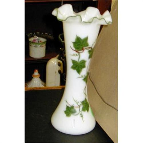 Told it was Consolidated Glass (con cora or regent line) hand painted white fluted vase with green ivy and brown stems. Green on fluted edge. Buyer pays shippiing and handling costs.