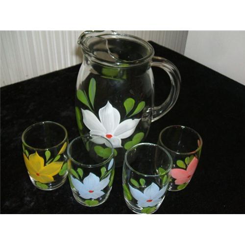 Gay Fad Juice Pitcher and 4 matching glasses set. Hand Painted Floral Pattern. Excellent Condition. 1960-1970. Very cute little set.