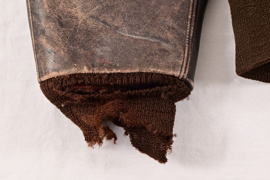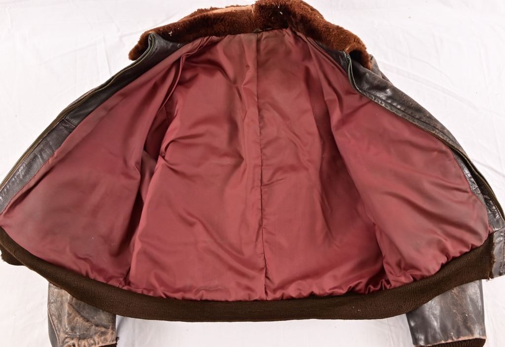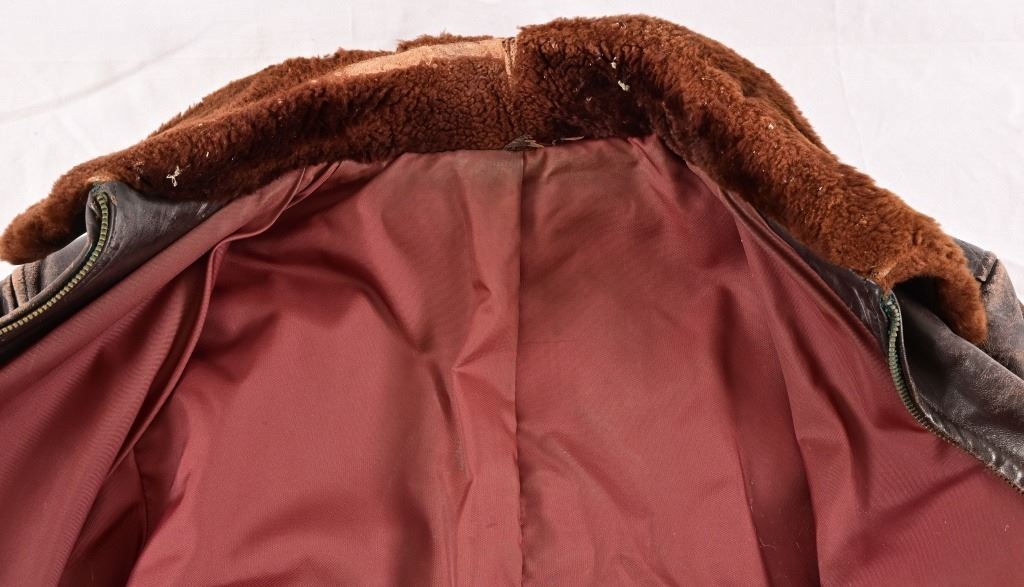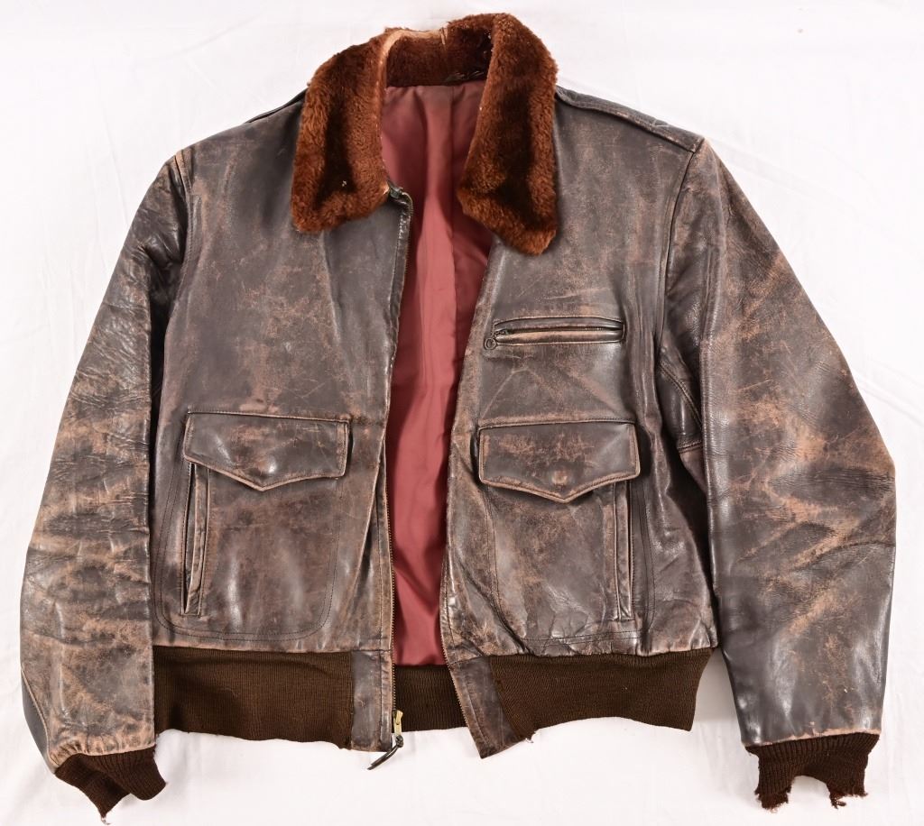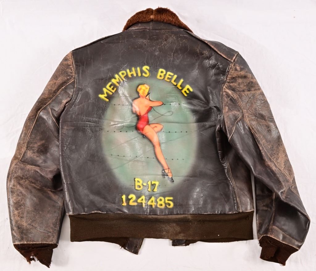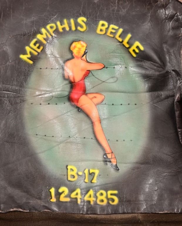 Vintage flight jacket with contemporary commemorative airbrush and hand-painting of the infamous "Memphis Belle" Boeing B-17 bomber of WW2. Approximately size M-L.