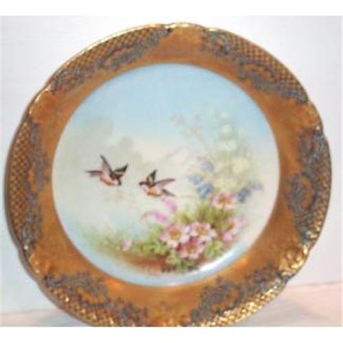 This extremely LOVELY and well executed Hand Painted Limoges Bowl is decorated with colorful flying birds and bright blooming flowers and around the edge of the bowl is all gold gilt with wonderful hand painted blue scrolling. The bowl is signed by the artist "Golse" and is in SUPERIOR condition with no chips, cracks, dings, hairlines and no wear to the gold or painting. This bowl measures 9.50" in diameter and stands 2" tall and is double marked on the back with the familiar Limoges Logos. A STUNNING piece of true art work !