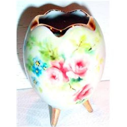This fantastic Hand Painted Egg Shaped Footed Toothpick holder is decorated with lovely blooming roses and gold gilt feet. It is in SUPERIOR condition with no chips, cracks, dings or hairlines and measures 2" in diameter and stands about 3" tall. It is not marked by the whiteware manufacturer but is marked by the artist in Japanese.