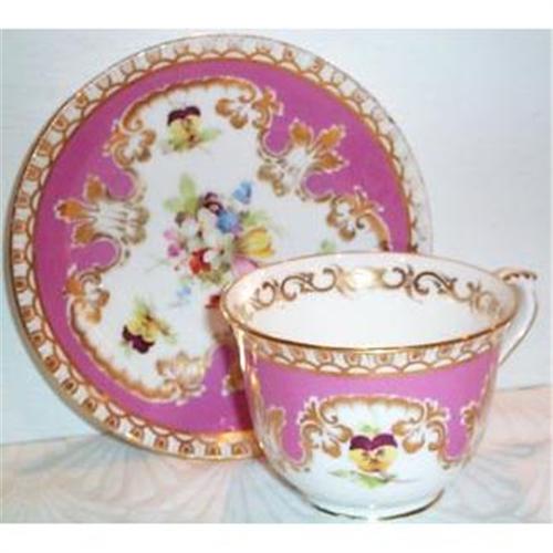 This extremely lovely Hand Painted Large Cup and Saucer is decorated with fantastic and quite colorful pansy flowers and well as roses and a bouquet of other flowers. The cup and saucer are in EXCELLENT condition with no chips, cracks, dings or hairlines and the cup measures 4.25" in diameter and stands a very stately 3.50" tall while the saucer is 6.50" in diameter. Each has a wonderful gold trim that does show some wear but this only attests to its age and does not detract from its appearance nor its value. They are not marked but judging from the porcelain and they quality of the hand painting these are Limoges, France pieces. We actually have five of these cups and saucers and each one has a slightly different bouquet of flowers but always shows the pansy flowers on the outside of each cup and saucer. Even the insides on the bottom of each cup are hand painted with lovely flowers. Please see our other listings for the additional cups and saucers in this pattern.
