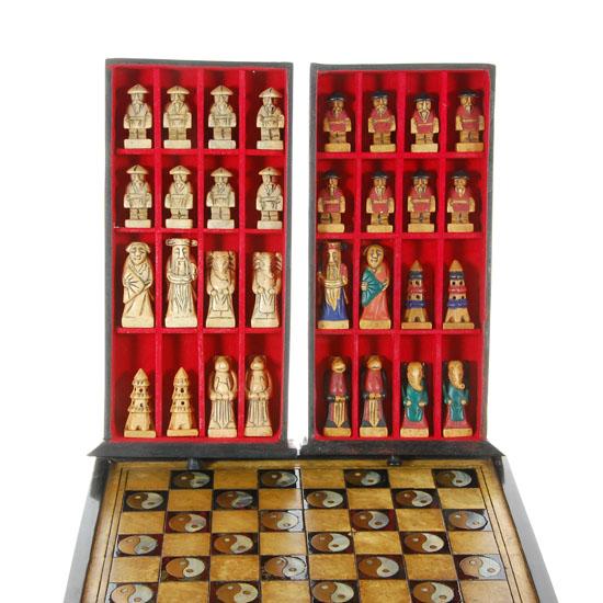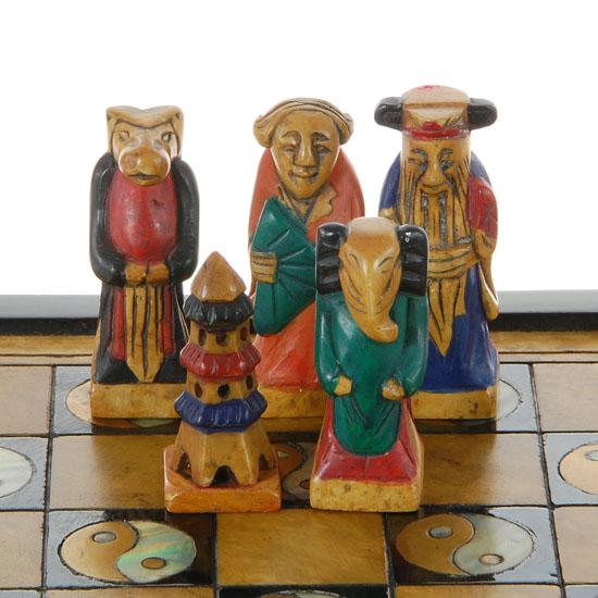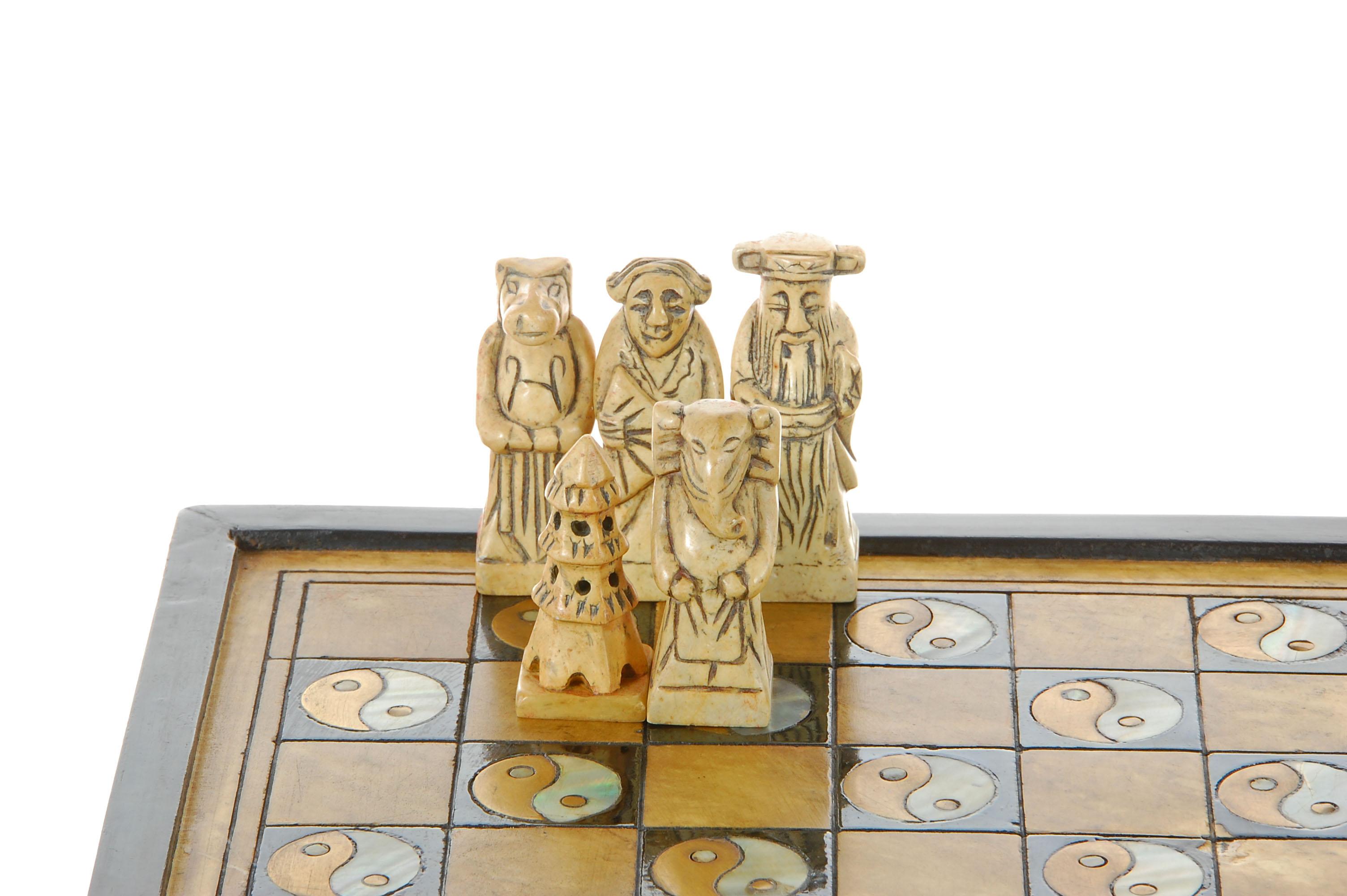 Excellent Inlaid Marble, Brass & Mother of Pearl playing board/storage box, Yin/Yang Design, 10.5"x10.5". Playing pieces handcarved marble, largest piece 2.25".