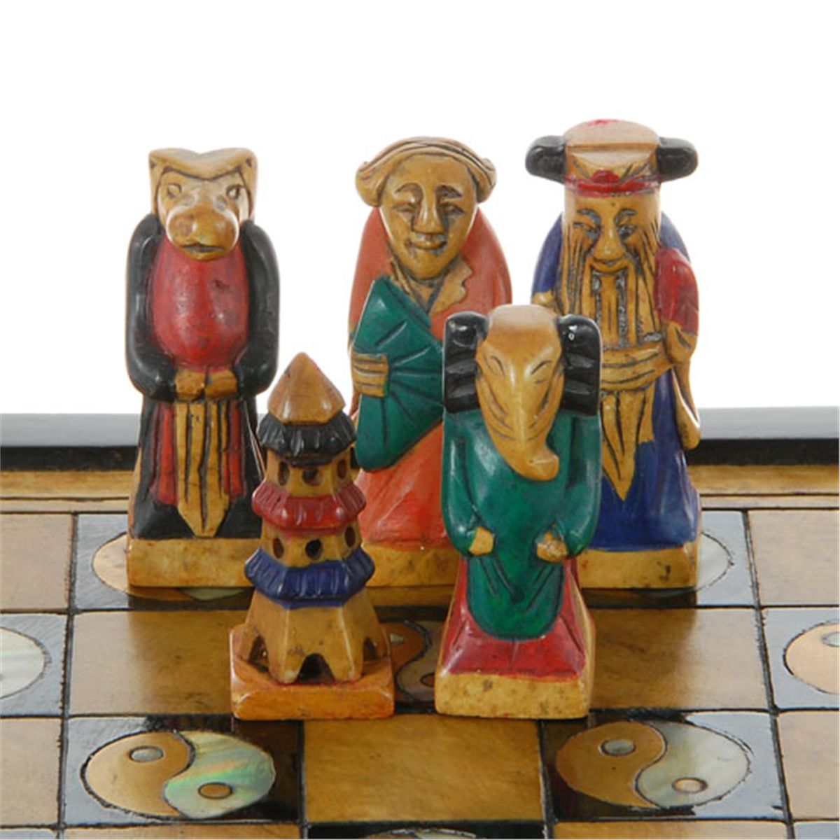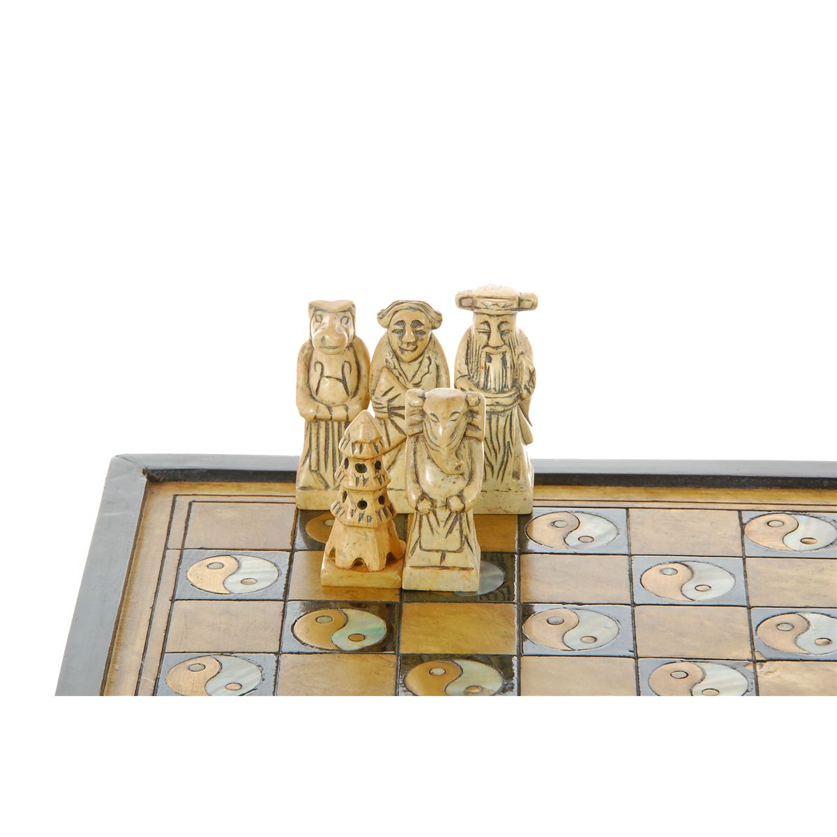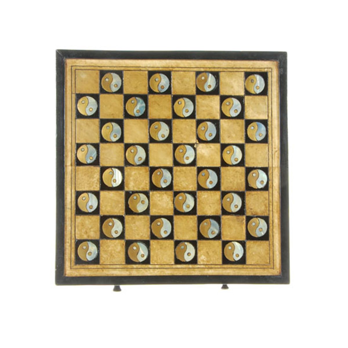 Excellent Inlaid Marble, Brass & Mother of Pearl playing board/storage box, Yin/Yang Design, 10.5"x10.5". Playing pieces handcarved marble, largest piece 2.25".