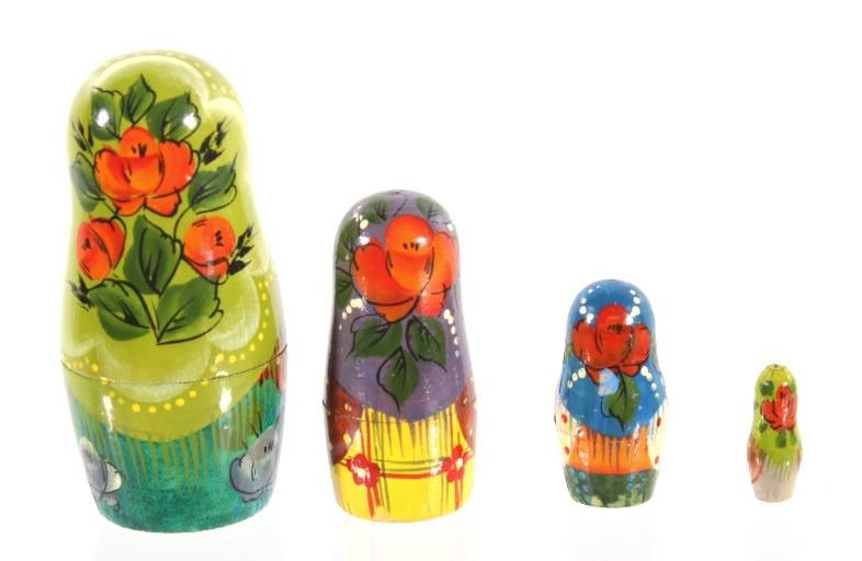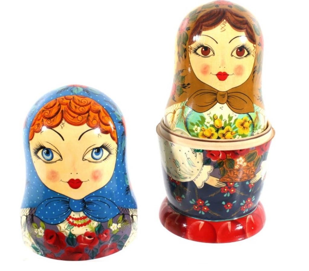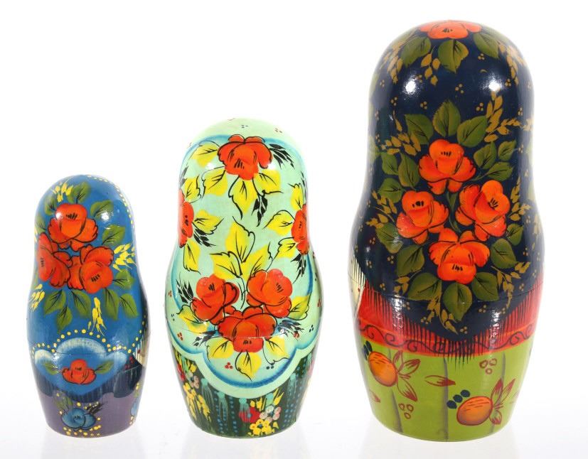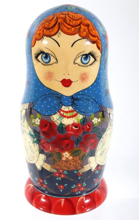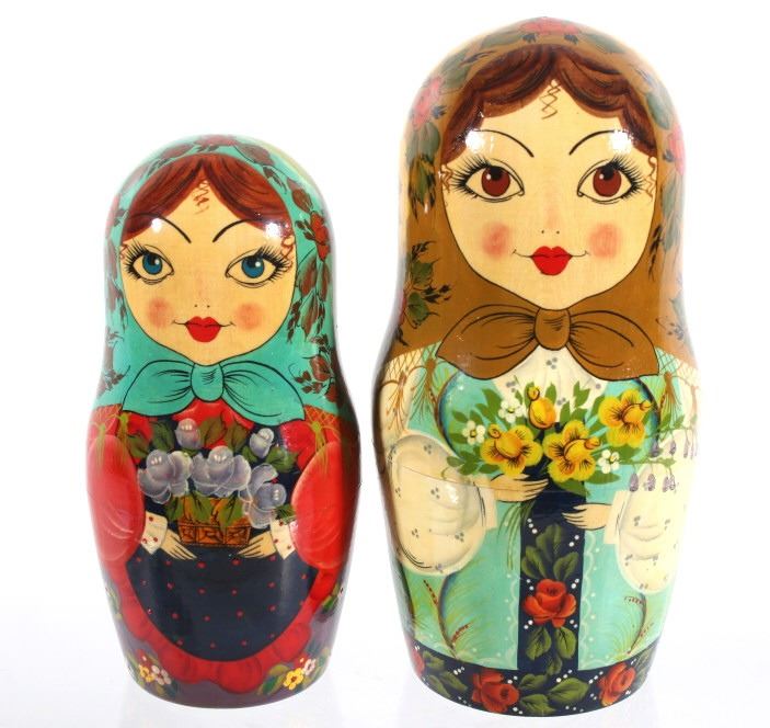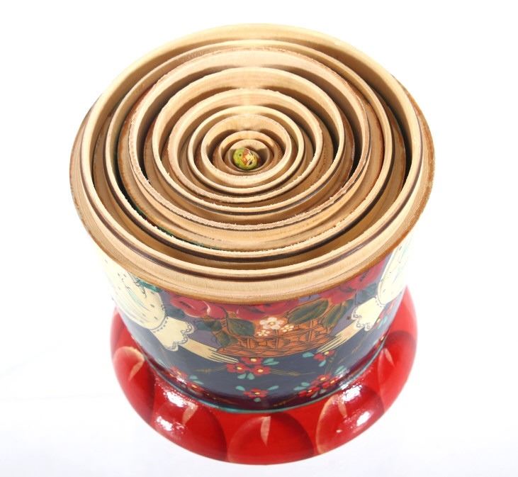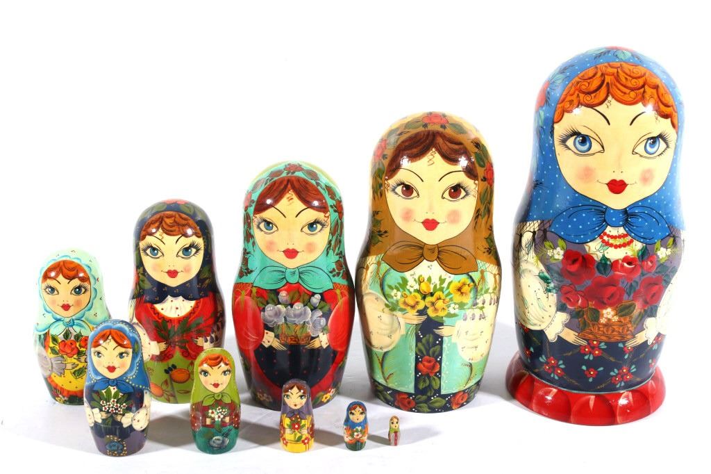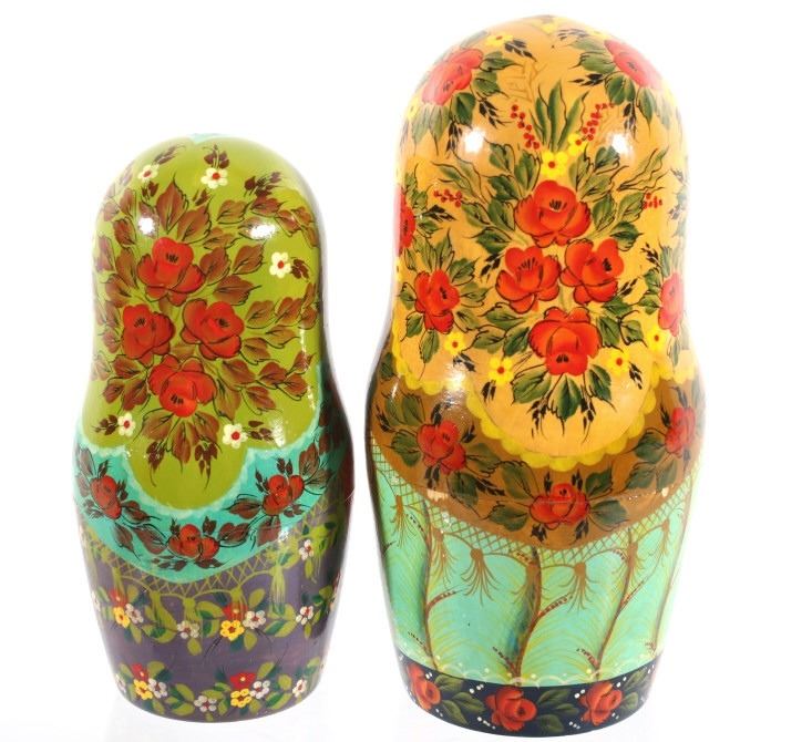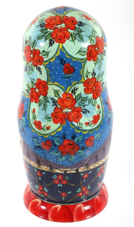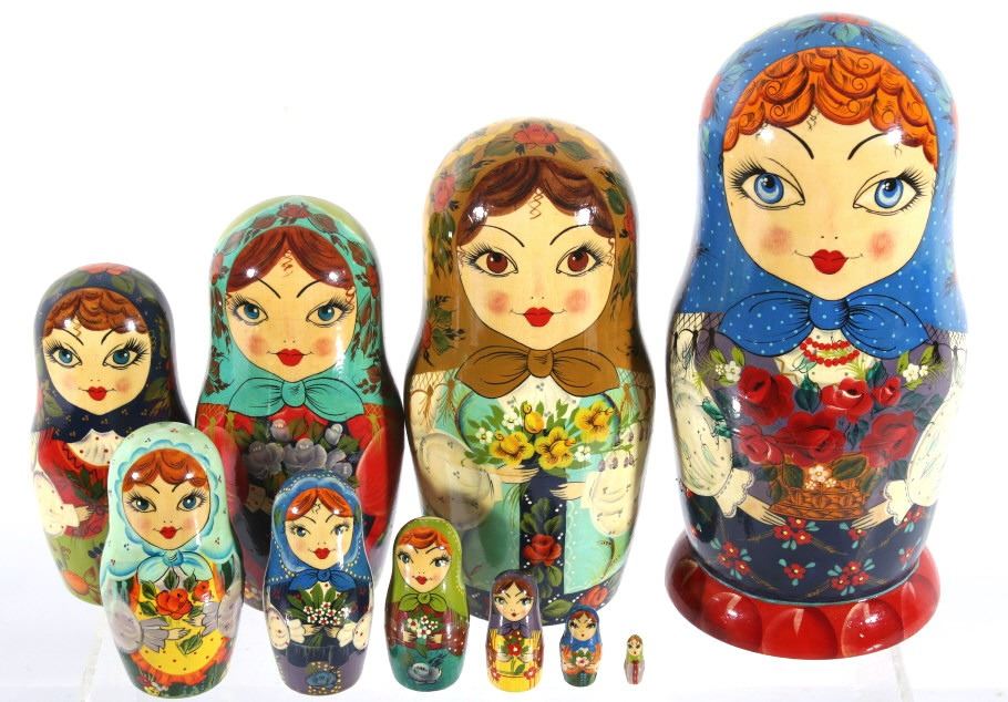 For your consideration in this lot we have a matyroshka hand painted 10 piece Russian nesting doll. The dolls where invented in 1890 by Vasily Zvyozdochkin at the Children's Education Workshop. The dolls are referred to as nesting dolls as each doll separates at the middle to shows a smaller, similar doll inside, which in turn has a even smaller doll inside it, and so on. This set shows wooden construction with hand painted exteriors showing a woman in a shawl with flowers in her hands. The set comes with a total of ten dolls, each smaller than the one before it. The dolls show very good condition overall. The largest of the dolls measures 9" tall with a diameter of 4" and the smallest measures 3/4" tall.