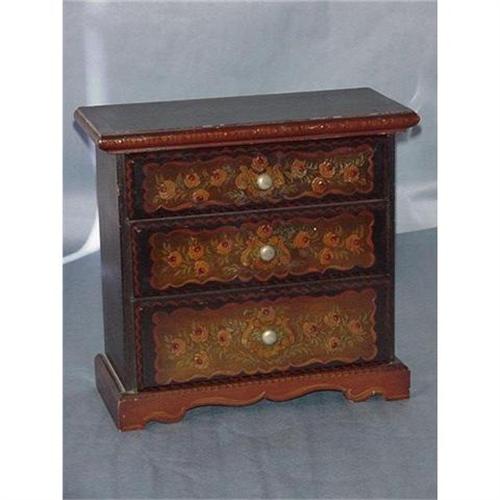 A miniature chest of drawers, 10 1/4" tall, 10 3/4" long, 5 1/4" wide. The three drawer fronts painted with flowers and the sides with panels and hearts. A pretty little chest for jewelry or just for the miniature collector. Condition is very good