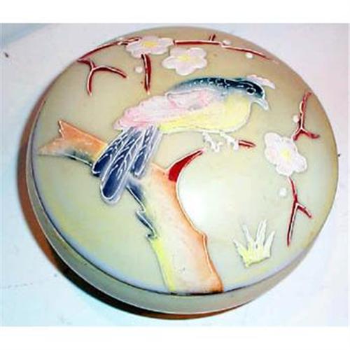 This fantastic hand painted Powder Jar is done is a moriage type style and is hand painted with a bird and cherry blossoms. The powder jar is in SUPERIOR condition with no chips, cracks, or dings and it measures 5" in diameter and stands 2" tall. Sorry to say I don't know the maker.