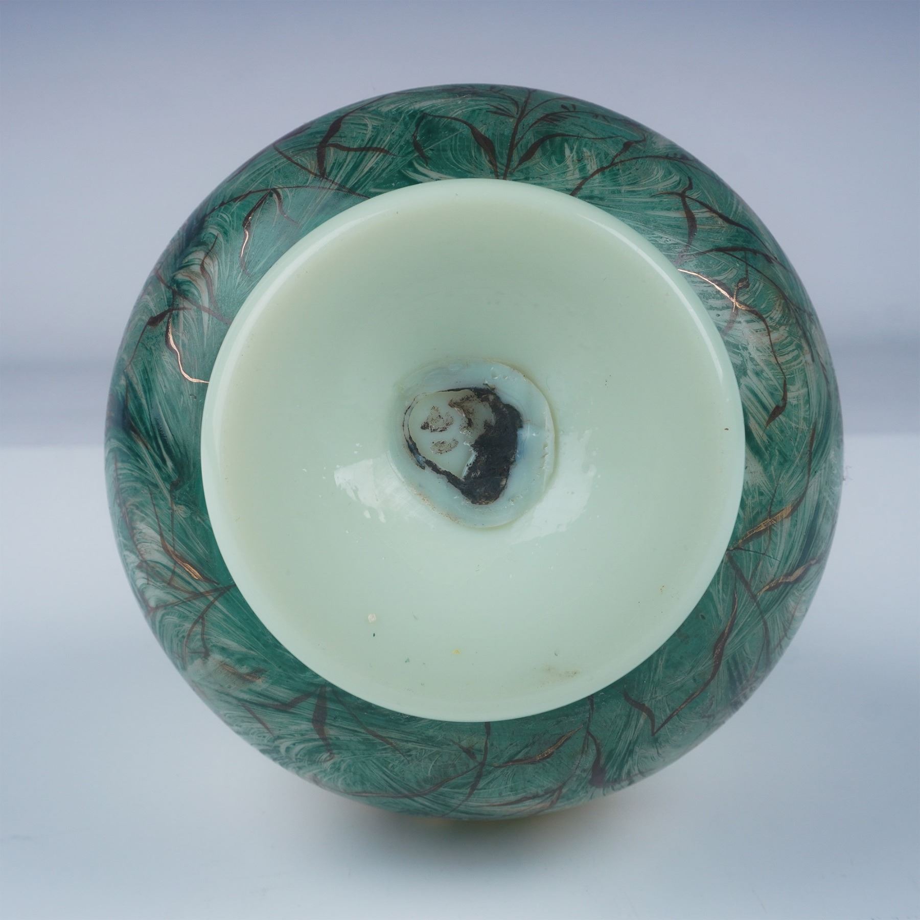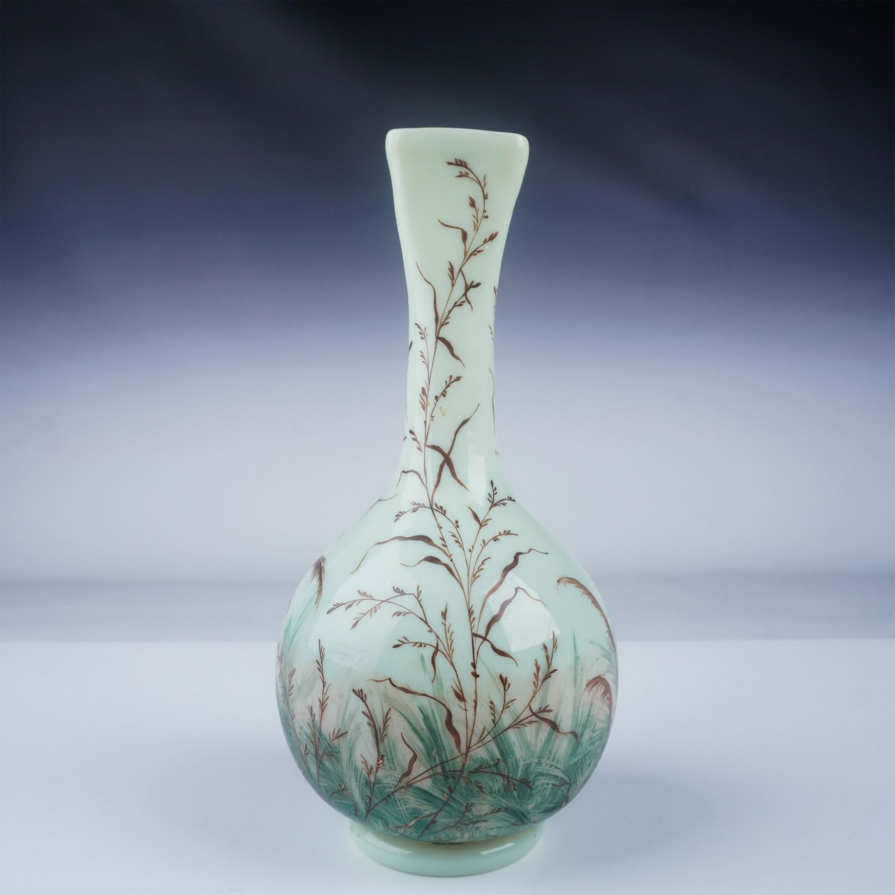Mt. Washington uranium glass vase, 10.25 inches tall, featuring a hand-painted design of leaves and grasses with gold accents. Glows vibrant green under UV light, adding to its charm. The vase has a triangular neck and bulbous body, with no maker's mark but a pontil mark indicating its handcrafted origin.
