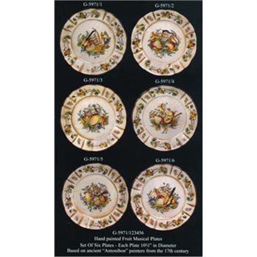 Capodimonte Porcelain Hand Painted Musical Fruit Plate Complete Set. A total of 6 plates. Each plate is 10.5" in diameter. Based on acient "Antonibon" painters from the 17th century. Satisfaction Guaranteed All our capodimonte pieces are 100% authentic, made with the best craftmanship in Italy. Capodimonte is more than a century Italian style of the finest porcelain once reserved for kings and queens. The style became popular when the royal family in Italy fell in love with the beauty of Capodimonte arts. The selection you see is made by artisans, according to the same tradition dating back to the 18th Century.<BR>Free Shipping in the continental US