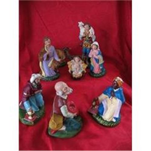 This vintage hand painted Nativity Set from Italy has 3 different marks on the bottoms: Italy, Hand Painted Italy and Made in Italy. Some still have the 69 cent price marked on the bottom and I believe they are not an exact matched set because of the different markings on the bottom, as collectors and owners replaced missing pieces of their sets over the years. The 8 piece set is in good + condition and includes: Mary, her nose needs to be touched up with flesh colored paint (5 inches tall, 2 1/4 inches wide), Joseph, his staff is missing from his left hand, which could easily be replaced with a heavy gauge piece of floral wire, and also needs to be touched up with flesh color paint (5 1/2 inches tall and 3 inches wide), Baby Jesus (3 inches tall and 2 3/4 inches long), Wise Man with white turbin (5 3/4 inches tall and 4 inches wide), Wise Man with orange turbin (5 1/2 inches tall and 3 1/2 inches wide), The Weary Traveler offering a hat full of gold (6 inches tall and 4 inches wide), the Farm Boy holding a sheep (7 inches tall and 2 3/4 inches wide) and the Bull (2 1/2 inches tall and 5 inches long. This set with it's minor flaws was taken care of through the years because the colors that include gold, orange, yellow, red, green, white, aqua blue, flesh, pink, browns, lavender and light and dark blue are still bright and clear. A wonderful addition to any Italy or Vintage Christmas Nativity Collection. <BR>SH & Ins. will be quoted after orders placed. If you have questions please ...