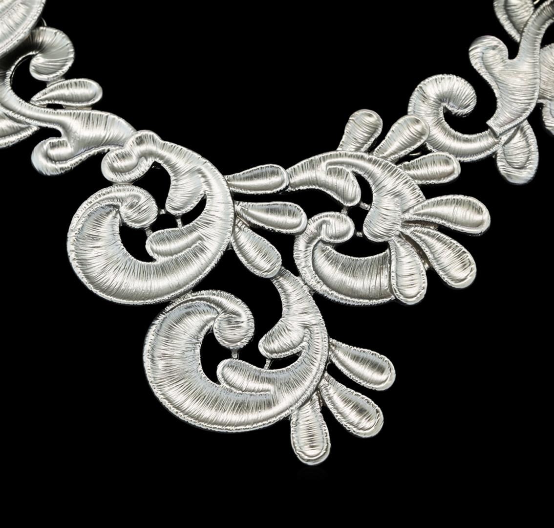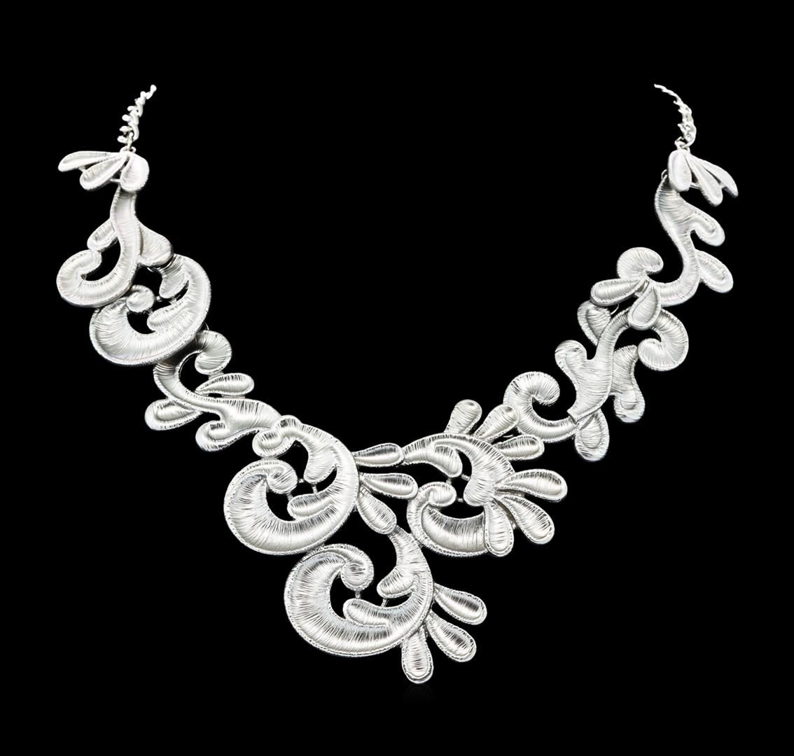 High end designer jewelry. Hand Painted Necklace - Rhodium Plated. Rhodium Plated Chain/3" Ext Clasp. Silver. 16inches. Total Weight: 66.5 grams.