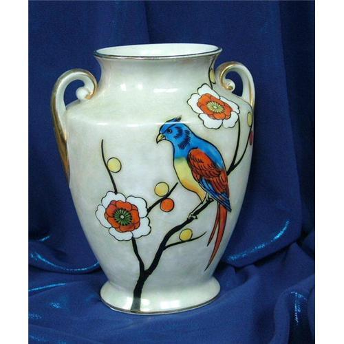 A sensational piece of Art Deco dating back to the 1920s-1930s.This stunning double-handled luster vase is decorated with a very colorful parrot and flowers hand-painted on a rare pearly grey background. <p>The colors in the parrot are blue, orange, red and yellow. In the floral design the branches are black with large flowers in yellow, white and orange.<p>The two handles have a gold finish. There is a gold band around upper rim and around the base.<p>This vase stands 6 1/2 " tall x 5 1'2' from handle to handle.<p>It's condition is VERY good! No chips, cracks or repairs. There is some gold wear, while the luster finish and the painted designs are still like new.<p>Can you picture this beautiful vase filled with Holly and Red Berries for this upcoming season ?<p>ALL OFFERS WELCOME <p>