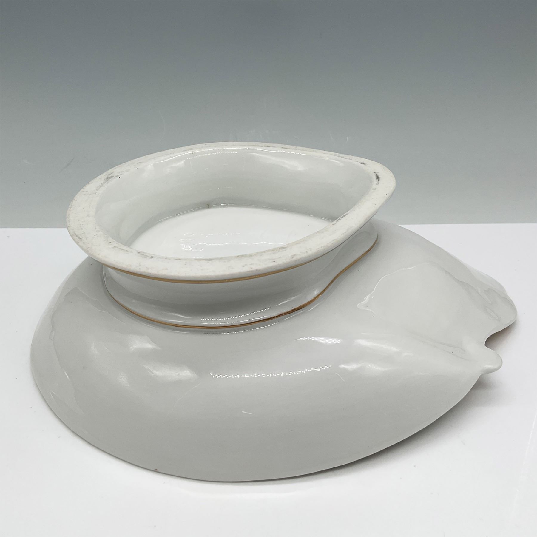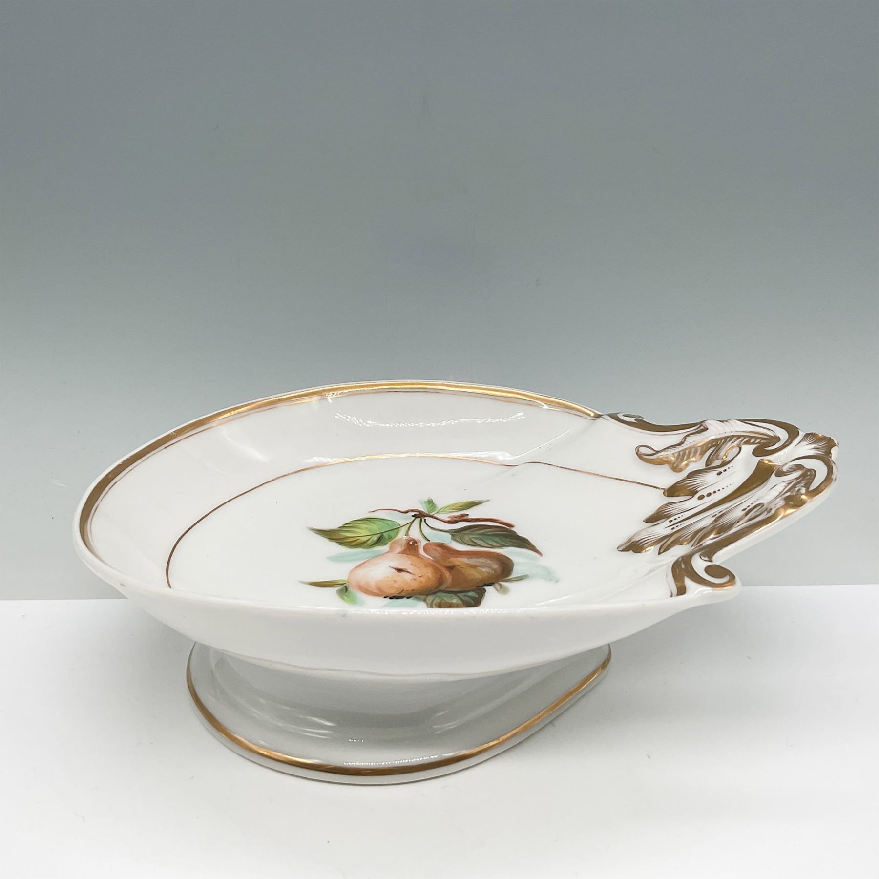 An elegant antique porcelain compote bowl featuring a hand-painted pear motif at its center, encircled by delicate gold accents. The bowl has a uniquely scalloped edge with an ornate raised and gilded decorative flourish, adding to its sophistication. The pedestal base is also highlighted with gold trim, complementing the overall design. The piece showcases fine craftsmanship, likely European, and is reminiscent of 19th-century porcelain artistry.